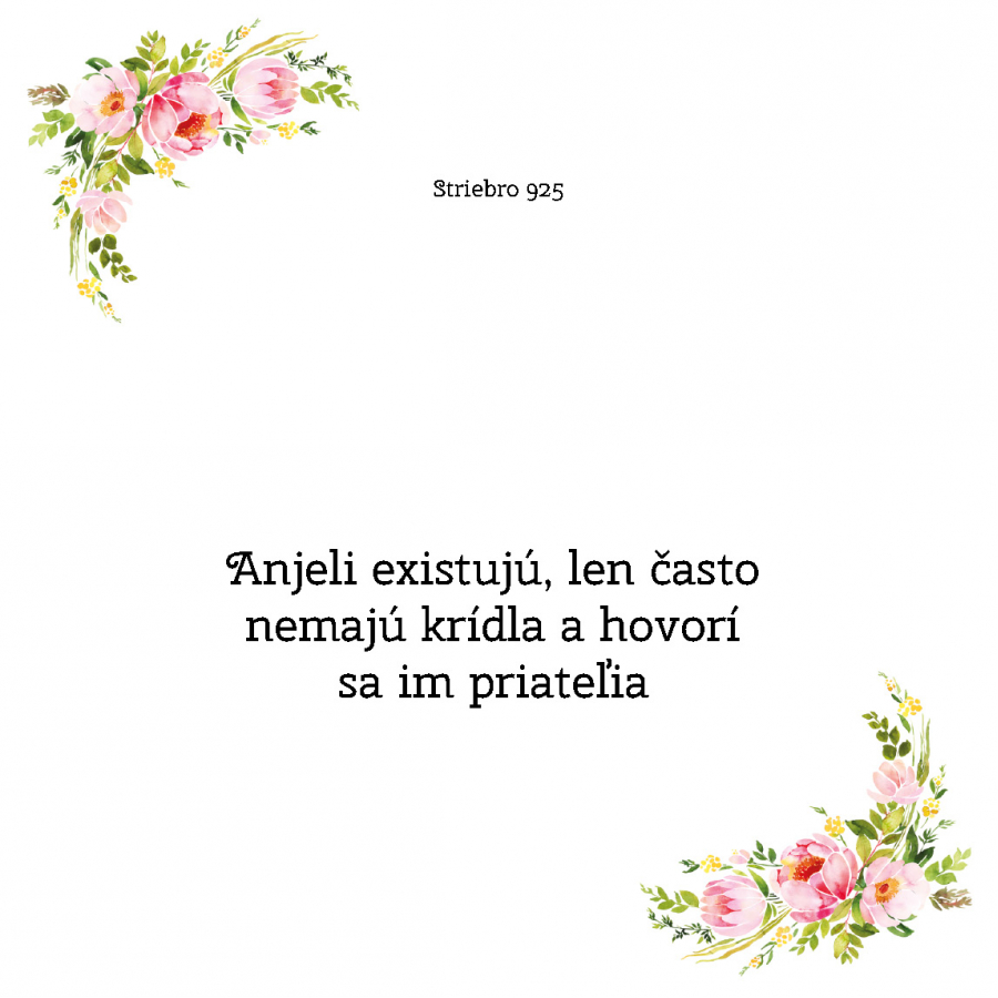 Darčekový set obsahuje strieborný náhrdelník anjel držiaci srdiečko zo zirkónu. Je zavesený na darčekovej karte s nádherným prianím „Anjeli existujú, len často nemajú krídla a hovorí sa im priatelia“. Krásny nežný darček pre kamarátku, ktorá je vašim strážnym anjelom.
