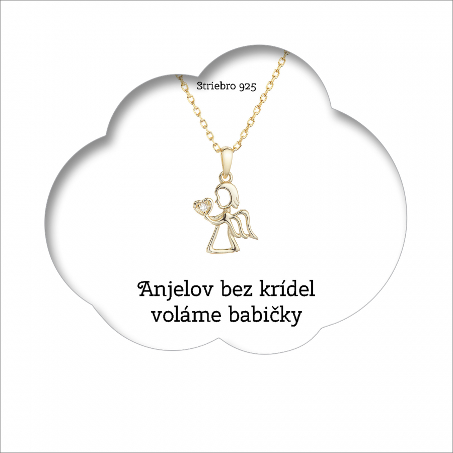 Darčekový set obsahuje pozlátený strieborný náhrdelník anjel držiaci zirkón v srdiečku , ktorý je zavesený na darčekovej karte s nádherným prianím "Anjelom bez krídel hovoríme babičky". Krásny nežný darček pre vašu babičku, ktorá je vašim strážnym anjelom. Vzťah vnúčite s babičkou je jedinečný, krásny a neprekonateľný.