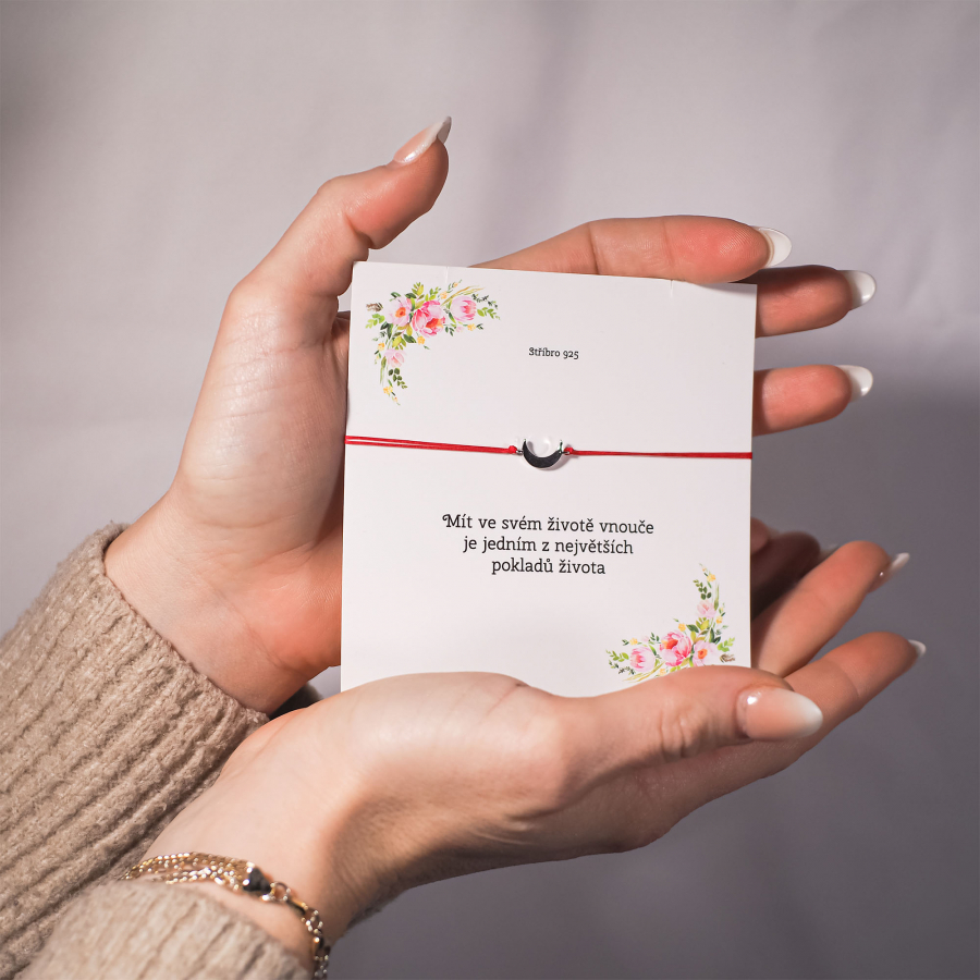 Dĺžka náramku 13044.3 sa reguluje posúvaním šnúrky v uzle, maximálne 25 cm. Strieborný mesiac je vyrobený z rhodiovaného striebra 925/1000 a môžu ho bez problémov nosiť aj alergici.