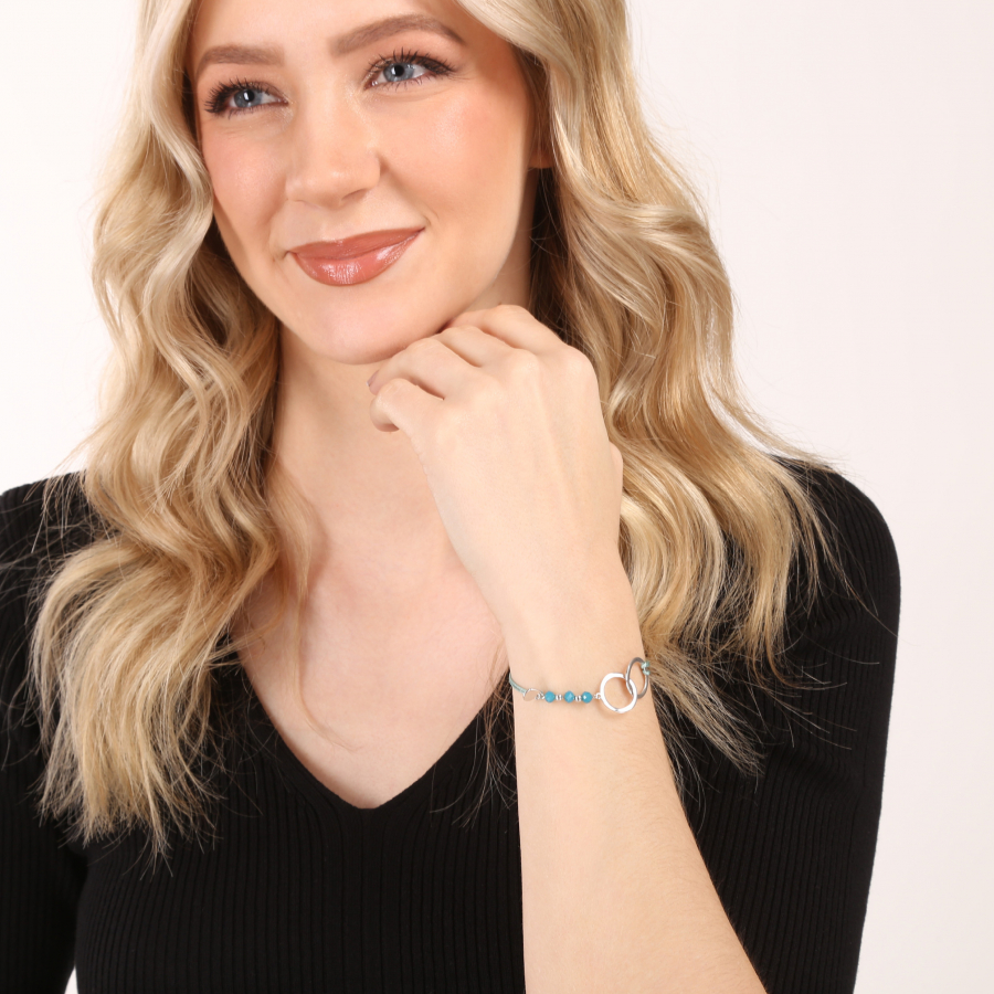 Tyrkysová šnúrka symbolizuje pokoj, rovnováhu a ochranu , čo prináša pocit harmónie a pozitívnej energie. Spojené krúžky na náramku predstavujú nekonečné spojenie, čo zdôrazňuje význam prepojenia a večnej jednoty. Malé strieborné srdiečko dodáva náramku jemný a elegantný prvok, symbolizujúci lásku, súcit a ochranu.