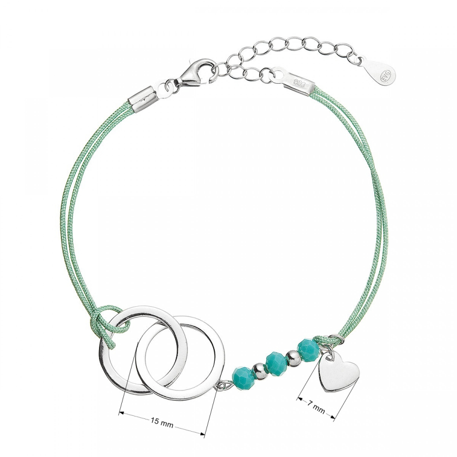 Krúžky, srdiečko a guličky sú vyrobené z rhodiovaného striebra 925/1000 a navyše náramok zdobia fazetované korálky v tyrkysovej farbe.