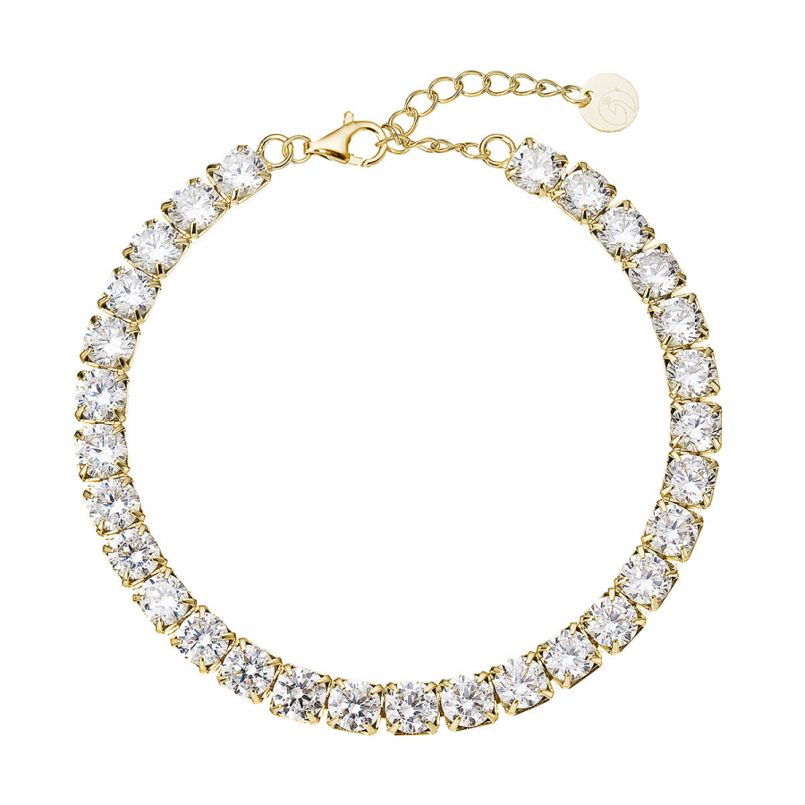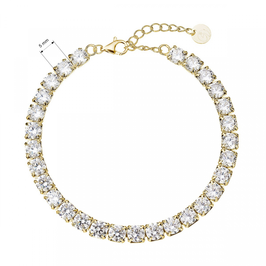 Luxusný tenisový náramok z pozláteného striebra osadený žiarivými zirkónmi predstavuje šperk, ktorý si hovorí o pozornosť. Jeho oslnivý lesk a precízne spracovanie z neho robí výnimočný doplnok pre slávnostné udalosti aj ako dar s veľkým významom. Každý zirkón je dokonale brúsený, výrazný a neprehliadnuteľný. Vďaka nastaviteľnej dĺžke perfektne padne na každé zápästie. Trblietavé zirkóny o veľkosti 5 mm sú vsadené do pozláteného striebra rýdzosti 925/1000.