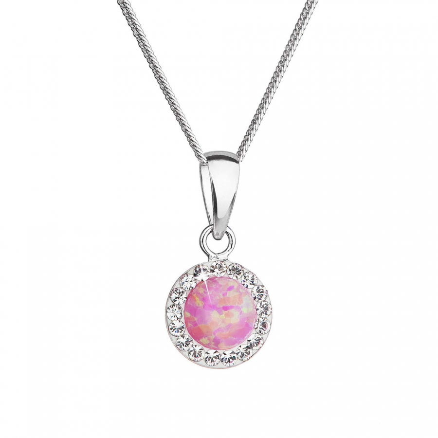 Náhrdelník obsahuje retiazku s okrúhlym príveskom. Šperk je vyrobený zo striebra rýdzosti 925/1000, ktoré prešlo povrchovou úpravou ródiom. Ródium chráni šperk proti sčernaniu, zožltnutiu i poškriabaniu. Prívesok je zdobený ružovým syntetickým opálom , ktorý je navyše olemovaný malými trblietavými Preciosa kryštálmi v bielej farbe. Môžete si k nemu vybrať aj rovnaké náušnice so zapínaním na puzetu alebo skrutku. Keďže šperk neobsahuje žiadny prídavok niklu , môžu ho bez obáv nosiť aj alergici.