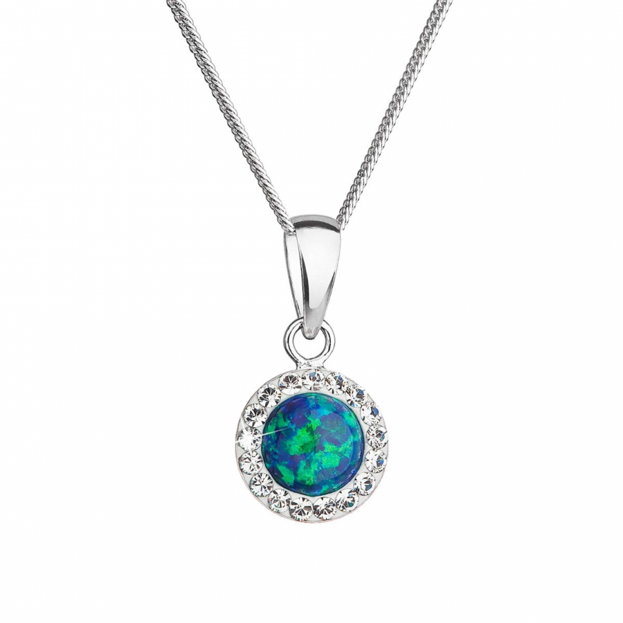 Náhrdelník obsahuje retiazku s okrúhlym príveskom. Šperk je vyrobený zo striebra rýdzosti 925/1000, ktoré prešlo povrchovou úpravou ródiom. Ródium chráni šperk proti sčerneniu, zožltnutiu i poškriabaniu. Prívesok je zdobený zeleným syntetickým opálom , ktorý je navyše olemovaný malými trblietavými Preciosa kryštálmi v bielej farbe. Môžete si k nemu vybrať aj rovnaké náušnice so zapínaním na puzetu alebo skrutku. Keďže šperk neobsahuje žiadny prídavok niklu , môžu ho bez obáv nosiť aj alergici.