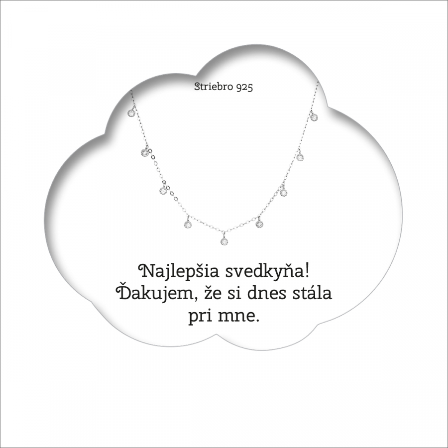 Darčekový set obsahuje strieborný náhrdelník s 9 malými okrúhlymi zirkónikmi , ktorý je zavesený na darčekovej karte s nádherným prianím "Najlepšia svedkyňa! Ďakujem, že si dnes stála za mnou". Krásny symbolický darček pre vašu svedkyňu, ktorá je vašou oporou a pomocnou rukou vo svadobný deň.
