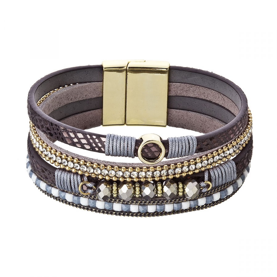 Luxusný hnedý náramok, ktorý si zamilujete na prvý pohľad . Zložený z viacerých textilných pásikov v elegantných hnedých tónoch, ktoré spolu tvoria výrazný a pritom veľmi nositeľný šperk. Každý opasok je jedinečný – semišové prúžky rôzne zdobené lesklými korálkami v zlatošedom odtieni, mozaikou z drobných štvorcových korálikov v šedobielom ladení a trblietavými kryštálmi lemovanými jemnou retiazkou z kovových guličiek v zlatej farbe.