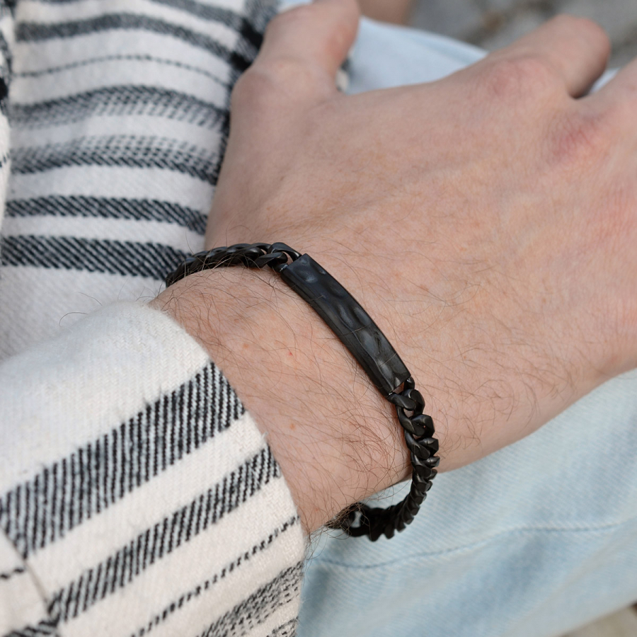 Štýlový pánsky náramok z matnej čiernej ocele, ktorý vyniká svojim moderným a minimalistickým dizajnom. Dominantným prvkom je ozdobná doštička, ktorá dodáva šperku elegantný a výrazný charakter. Matná povrchová úprava podčiarkuje jeho sofistikovaný vzhľad a zaisťuje odolnosť voči každodennému opotrebovaniu. Ideálny doplnok pre mužov, ktorí oceňujú jednoduchosť, kvalitu a nadčasový štýl. Vďaka nastaviteľnej dĺžke 20+3 cm perfektne sedí na zápästí a zaisťuje pohodlné nosenie.