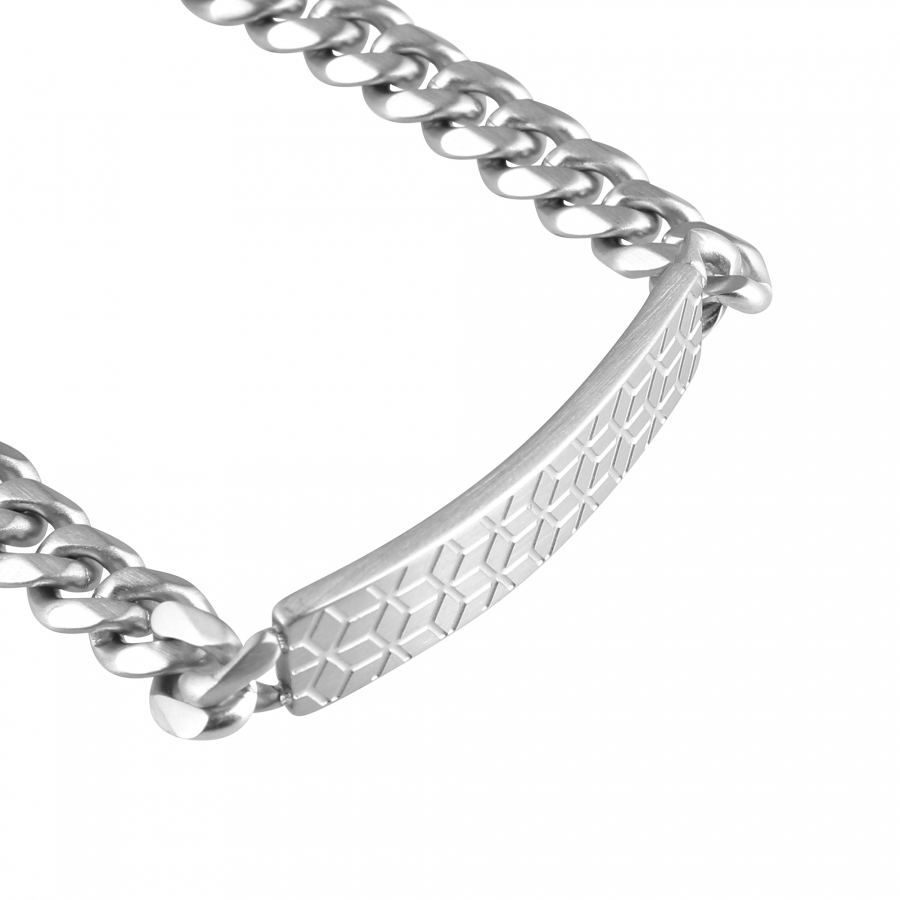 Masívny pánsky náramok z pieskovanej ocele, ktorý spája robustný štýl s modernou eleganciou. Hlavným dizajnovým prvkom je ozdobná obdĺžniková doštička, ktorá dodáva šperku jedinečný a sofistikovaný vzhľad. Povrchová úprava pieskovaním vytvára matný efekt, ktorý podčiarkuje mužnosť a odolnosť náramku. Ideálny doplnok pre mužov, ktorí hľadajú výrazný, ale zároveň univerzálny šperk na každodenné nosenie aj špeciálne príležitosti. Nastaviteľná dĺžka 20+3 cm umožňuje prispôsobenie pre perfektné padnutie.