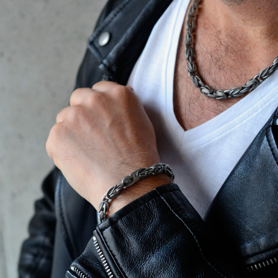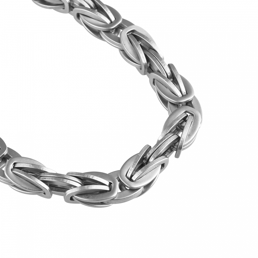 Masívny pánsky náramok z pieskovanej ocele, ktorý zaujme svojim robustným a moderným designom. Originálne do seba zapadajúce oká vytvárajú atraktívnu textúru a zaisťujú pevnosť aj pohodlie pri nosení. Povrchová úprava pieskovaním dodáva náramku matný a štýlový vzhľad, ideálny pre mužov, ktorí hľadajú výrazný doplnok. Nastaviteľná dĺžka 21+3 cm umožňuje prispôsobenie pre perfektné padnutie. Skvelá voľba pre milovníkov kvalitných a elegantných šperkov.