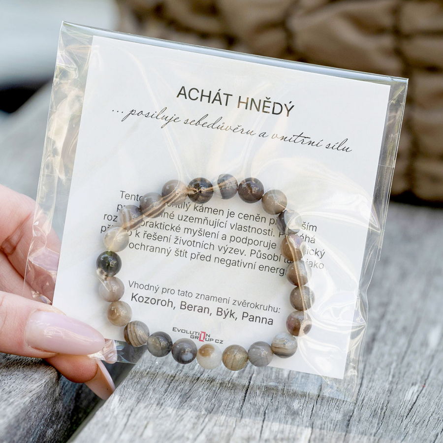 Náramok je navlečený na kartičke s popisom vlastností hnedého achátu a uložený v ochrannom sáčku. Súčasťou balenia je aj darčeková taštička - ideálna ako milý darček.