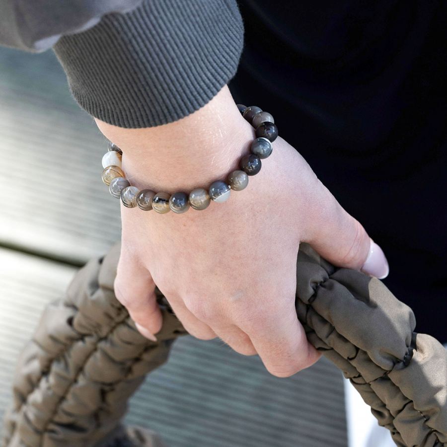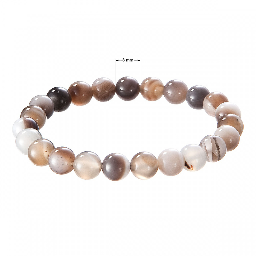 Elegantný náramok z prírodného hnedého achátu zaujme svojou paletou teplých farebných odtieňov – od jemne béžovej cez karamelovú až po sýto čokoládovú. Korálky s priemerom 8 mm majú hladký, lesklý povrch a vytvárajú harmonický celok, ktorý pôsobí prírodne, zemito a pokojne. Každá korálka je originálna svojim sfarbením aj vnútornou kresbou, čo robí z každého náramku jedinečný doplnok s vlastnou energiou.