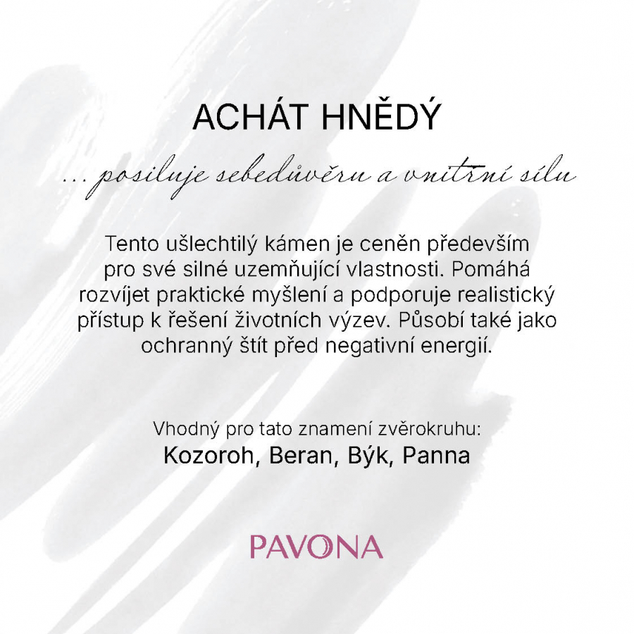 Tento štýlový náramok je vyrobený z pravých minerálnych kameňov hnedého achátu, ktorý sa vyznačuje svojou teplou, zemitou farbou a jemnými prírodnými vzormi. Namiesto klasických korálikov je zložený z oválnych kameňov s jemne brúsenými plochami, ktoré dodávajú náramku harmonický a vyvážený vzhľad, zatiaľ čo elastické prevedenie zaisťuje ľahké nasadenie a pohodlné nosenie na každom zápästí. Hnedý achát je symbolom stability, sily a ochrany, často spájaný s upokojením mysle a podporou vnútorného pokoja. Tento ušľachtilý kameň je cenený predovšetkým pre svoje silné uzemňujúce vlastnosti. Pomáha rozvíjať praktické myslenie a podporuje realistický prístup k riešeniu životných výziev. Pôsobí aj ako ochranný štít pred negatívnou energiou.