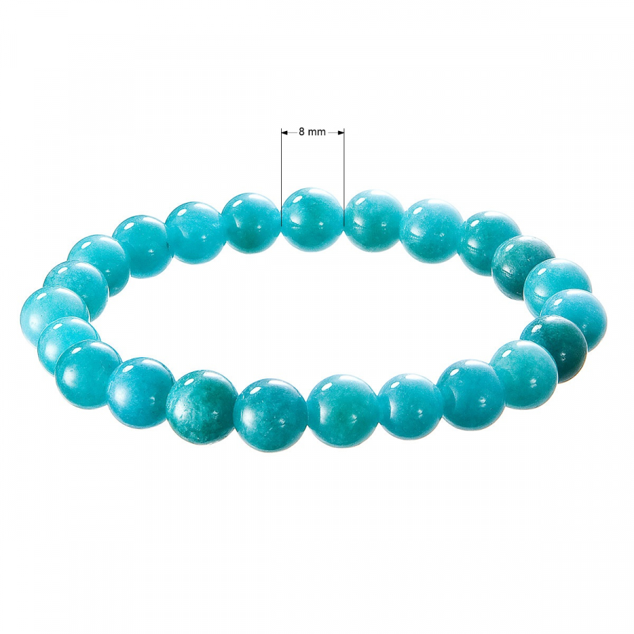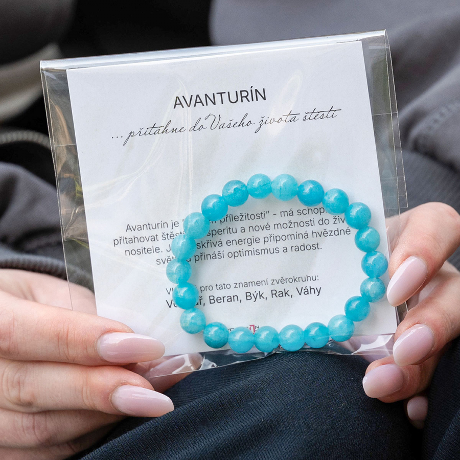 Elegantný náramok z pravého avanturínu zaujme svojim výrazným, tyrkysovo sfarbeným odtieňom – tyrkysové tóny sa harmonicky prelínajú s občasnými tmavo zelenými akcentmi. Hladké korálky s priemerom 8 mm majú prirodzený lesk a pôsobia sviežo a originálne. Každý náramok je jedinečný originál.