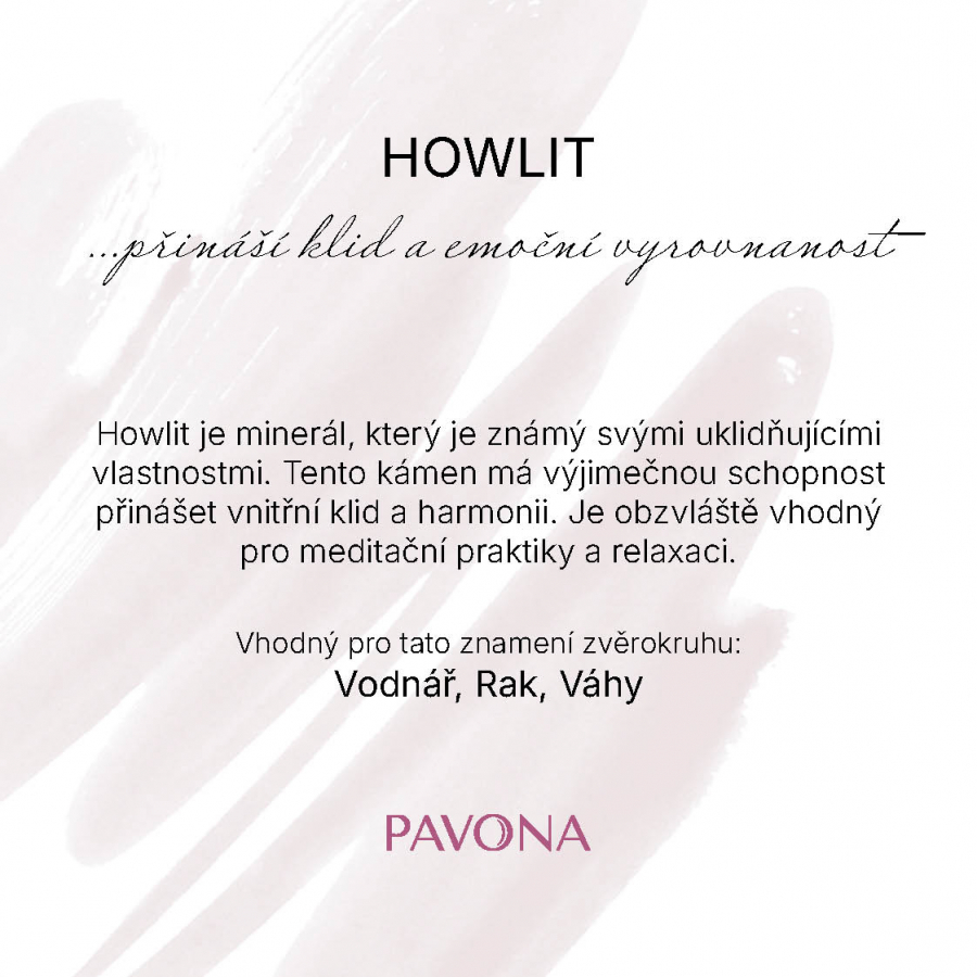 Howlit je známy ako kameň pokoja , trpezlivosti a vnútornej rovnováhy. Pomáha tíšiť rozbúrené emócie, podporuje sústredenie a napomáha pokojnému spánku. Je ideálnym pomocníkom pri strese, nespavosti alebo v obdobiach, kedy treba nájsť vnútorný hlas a upokojenie. Jeho jemná, ale silná energia harmonizuje telo aj myseľ.