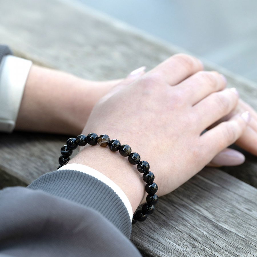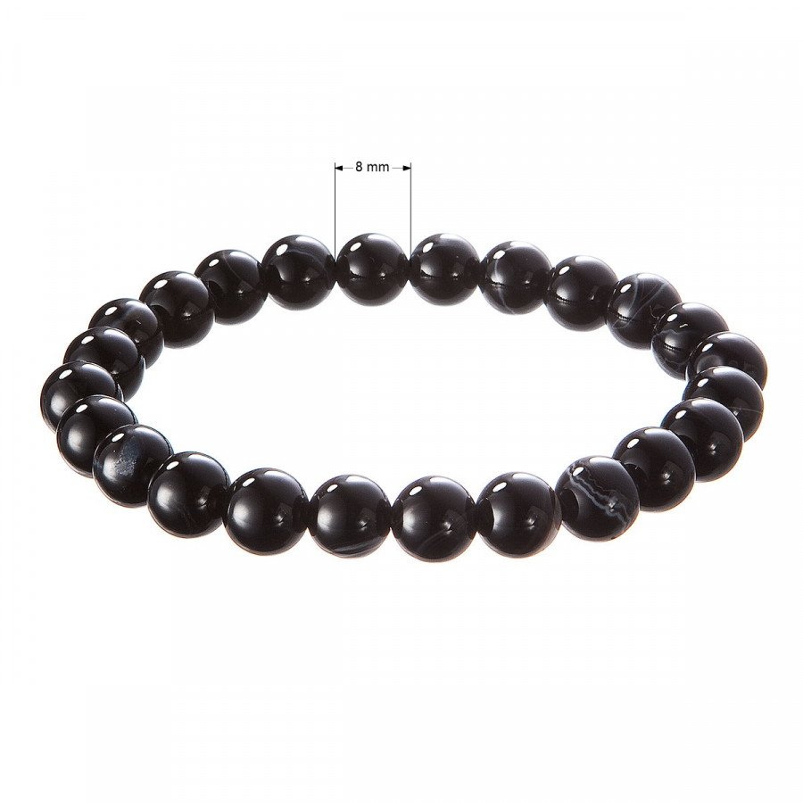 Elegantný náramok z prírodného onyxu zaujme svojou hlbokou, sýto čiernou farbou a lesklým povrchom. Hladké korálky s priemerom 8 mm pôsobia tajomne a sofistikovane – ich temný lesk pripomína nočnú oblohu bez hviezd. Každá korálka je precízne opracovaná a vytvára dojem pevnosti, stability a vnútornej sily. Onyx je obľúbený nielen pre svoju estetiku, ale aj pre svoju silnú symboliku.