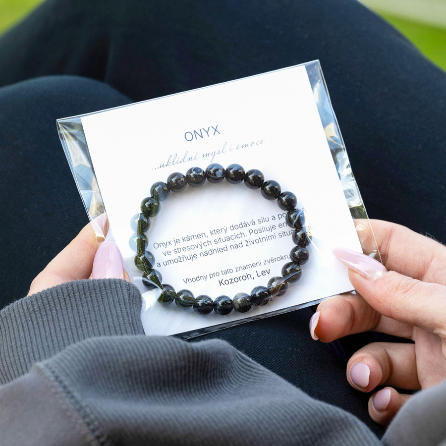 Náramok je navlečený na kartičke s popisom vlastností onyxu a uložený v ochrannom sáčku. Súčasťou balenia je aj elegantná darčeková taštička – ideálna ako vedomý darček pre vás alebo niekoho blízkeho.