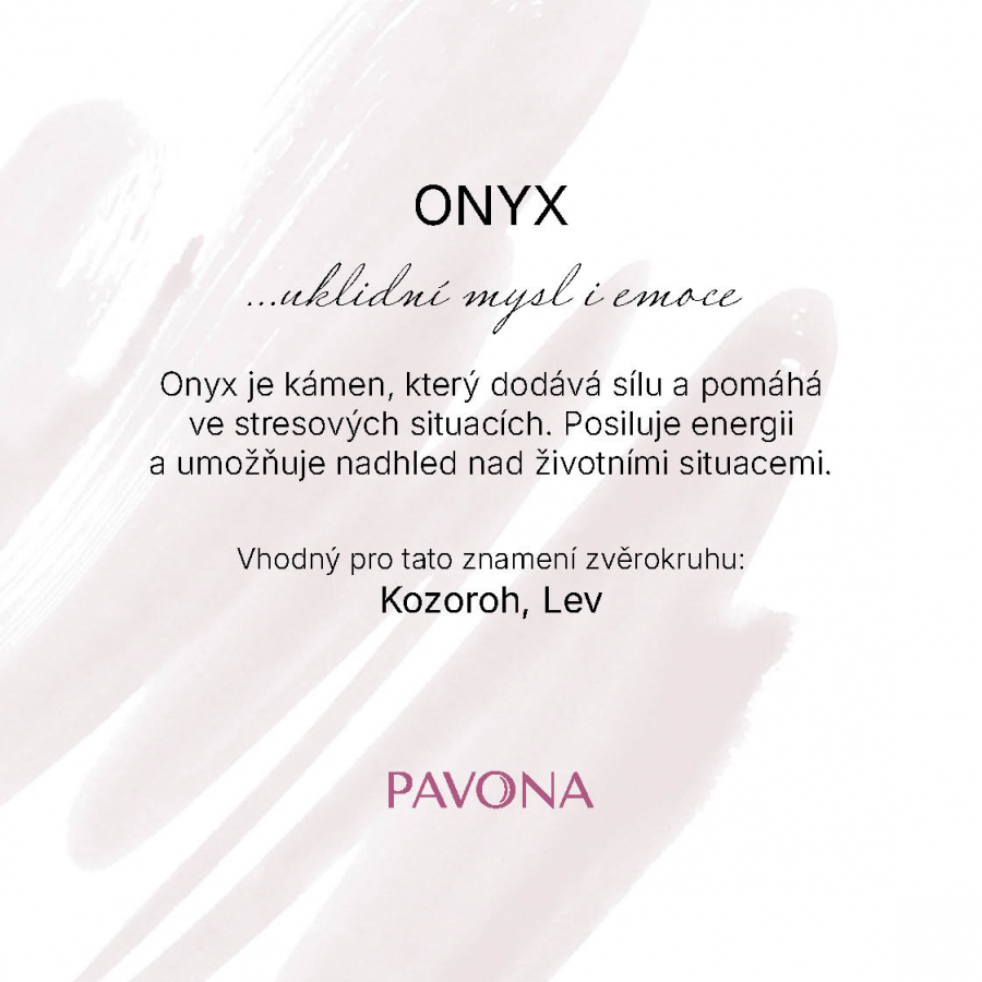 Onyx je od pradávna považovaný za kameň ochrany, odvahy a sebadôvery . Pomáha odstraňovať negatívne energie, posilňuje odhodlanie, koncentráciu a vytrvalosť. Je ideálnym sprievodcom v náročných obdobiach, kedy treba nájsť vnútorný pokoj, stabilitu a silu postaviť sa výzvam. Podporuje uzemnenie, psychickú odolnosť a jasné rozhodovanie.