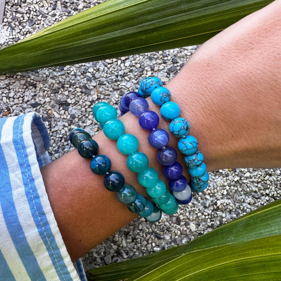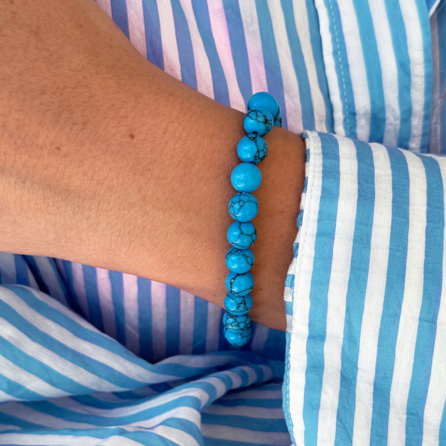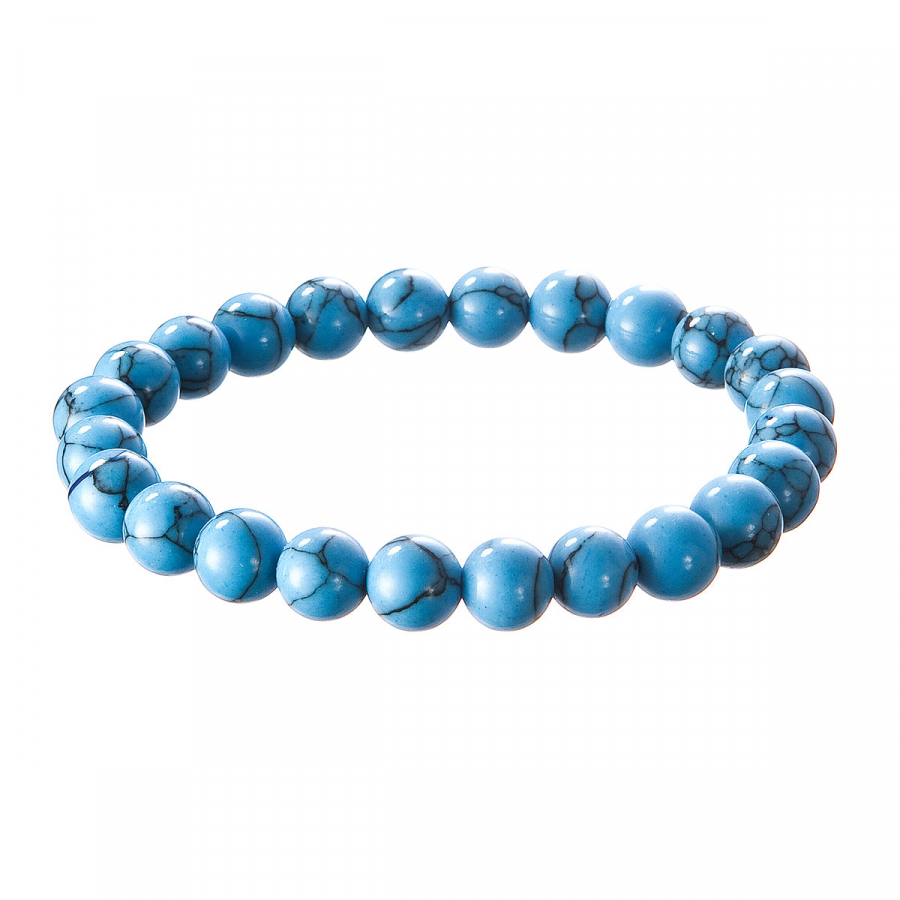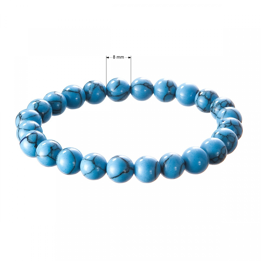 Tento štýlový náramok z tyrkenitu zaujme svojimi sviežimi tónmi tyrkysovej farby s charakteristickými šedočiernymi žilkami. Korálky s priemerom 8 mm majú hladký povrch. Každá korálka je jedinečná svojim zafarbením a kresbou, čo dáva každému náramku osobitý výraz a ľahko bohémsky nádych.