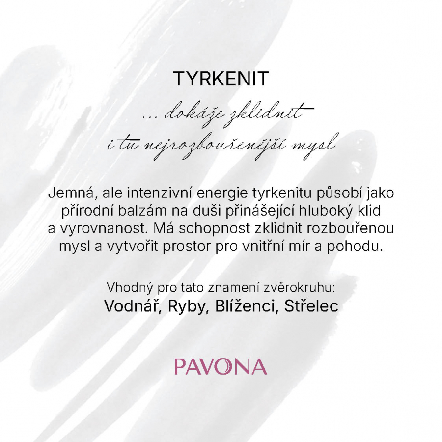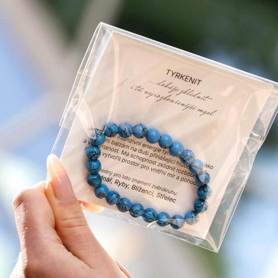 Náramok je navlečený na kartičke s popisom vlastností tyrkenitu a uložený v ochrannom sáčku. Súčasťou balenia je aj darčeková taštička – ideálna ako darček s myšlienkou alebo podpora v hektickom období.