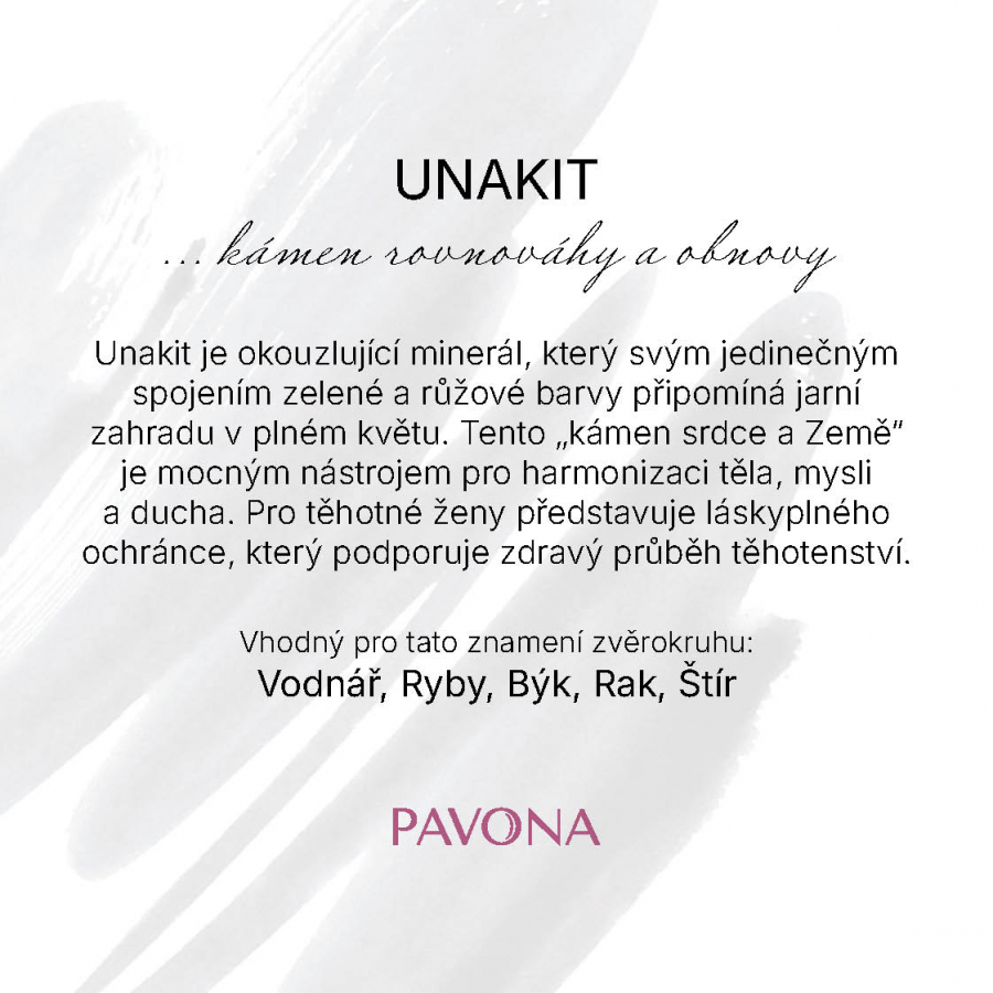 Elegantný náramok z pravých minerálnych kameňov unakitov je štýlovým doplnkom pre každú príležitosť. Oválne kamene s jemne brúsenými plochami. Unakit je okúzľujúci minerál, ktorý svojim jedinečným spojením zelenej a ružovej farby pripomína jarnú záhradu v plnom kvete. Tento „kameň srdca a Zeme“ je mocným nástrojom na harmonizáciu tela, mysle a ducha. Pre tehotné ženy predstavuje láskyplného ochrancu, ktorý podporuje zdravý priebeh tehotenstva. Vďaka elastickému prevedeniu sa náramok pohodlne prispôsobí zápästiu a je príjemný na nosenie.