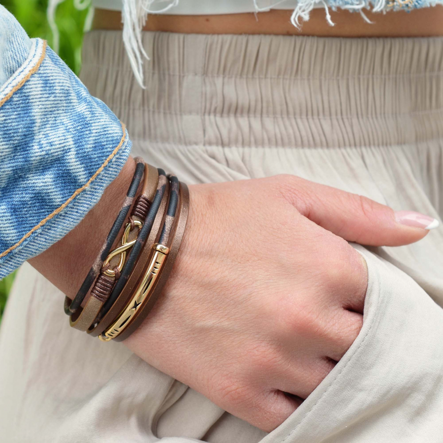 Moderný a elegantný hnedý náramok, ktorý očarí na prvý pohľad svojim originálnym prevedením. Skladá sa z viacerých pásikov v kombinácii semišu a koženky v jemnom, harmonickom usporiadaní. Dominantou náramku je symbol nekonečna (infinity) v zlatej farbe, ktorý dodáva šperku nielen štýlový vzhľad, ale aj nádych hlbšieho významu - nekonečnej lásky, priateľstva či slobody.