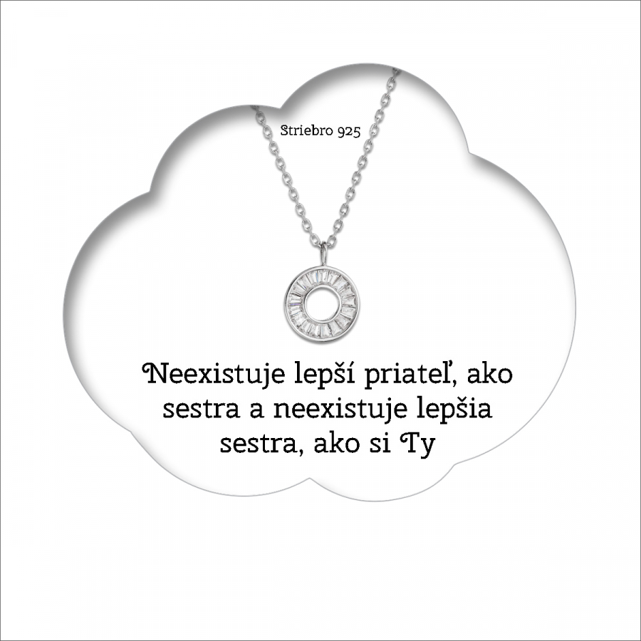 Darčekový set obsahuje strieborný náhrdelník s prekrásne trblietavým okrúhlym príveskom , ktorý je zavesený na darčekovej karte s nádherným prianím „Neexistuje lepší priateľ, ako sestra a neexistuje lepšia sestra, ako si Ty“. Krásny nežný darček pre vašu sestru. Mať sestru je ako mať priateľa, obrancu, poslucháčov a sprisahancov v jednom.