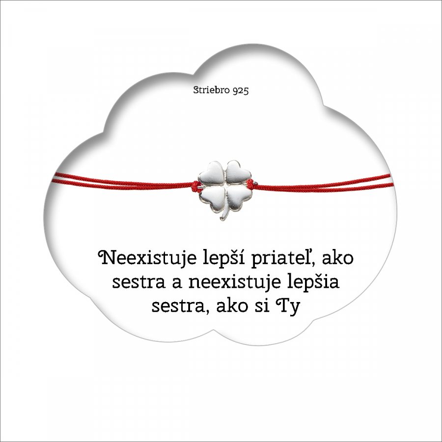 Darčekový set obsahuje červený textilný náramok so strieborným príveskom tvaru štvorlístka , ktorý je zavesený na darčekovej karte s nádherným prianím „Neexistuje lepší priateľ, než sestra a neexistuje lepšia sestra, ako si Ty“ . Krásny nežný darček pre vašu sestru. Mať sestru je ako mať priateľa, obrancu, poslucháčov a sprisahancov v jednom.
