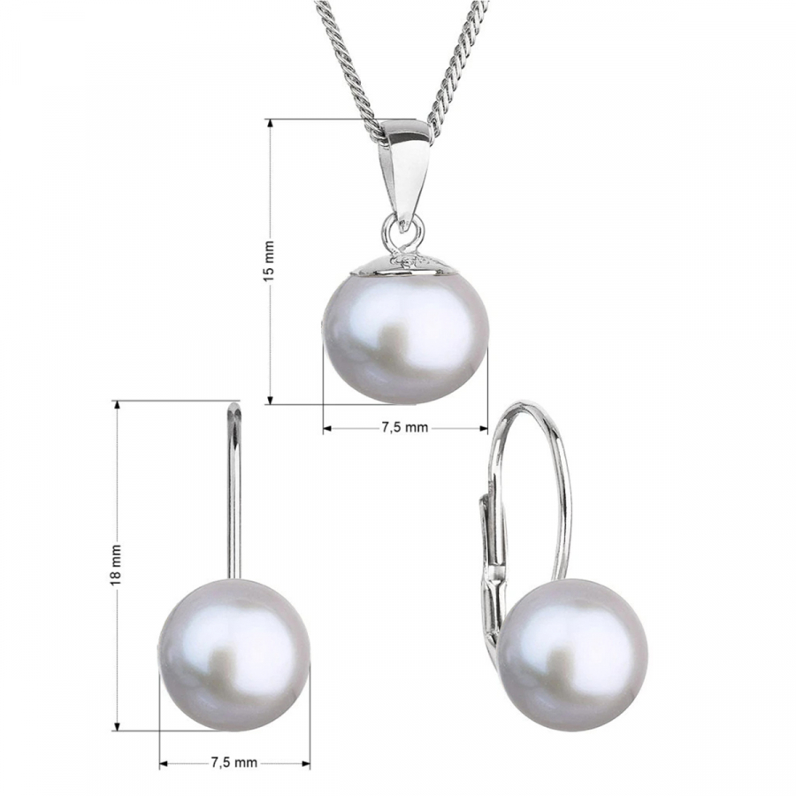 Súprava zo šedých riečnych perál obsahuje náušnice a prívesok na striebornej retiazke . Sladkovodné perly, ktorými sú šperky zdobené, majú kvalitu AA a priemer 7,5 mm. Šperky sú vyrobené zo striebra o rýdzosti 925/1000 vrátane povrchovej úpravy ródiom. Súpravu sa nemusia báť zaobstarať ani alergici, pretože šperky neobsahujú žiadny prídavok niklu. Náušnice zapnete na klapku , ktorá ich spoľahlivo ochráni proti nechcenej strate.