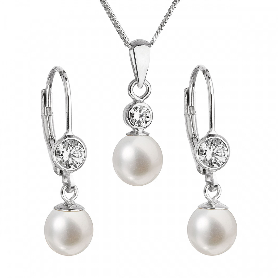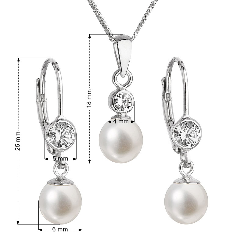 Súprava šperkov obsahuje 25 mm dlhé visiace náušnice ak tomu v rovnakom dizajne aj prívesok na striebornej retiazke . Striebro, ktoré sme na výrobu šperkov použili, má rýdzosť 925/1000 a prešlo povrchovou úpravou ródiom. Šperky z tejto súpravy sú zdobené pravou riečnou perlou kvality AA a veľkým priezračným zirkónom, ktorý šperkom dodáva výnimočný lesk. Do šperkov nie je pridaný žiadny nikel, a tak ich bez obáv môžu nosiť aj alergici. Zapínanie náušníc je na klapku.