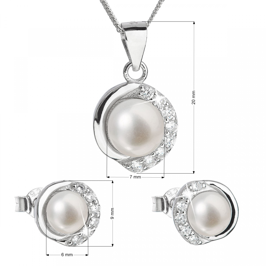 Šperky sú zdobené bielymi perlami patriace do kategórie najvyššej kvality AAA . Okrem nádherných perál je súprava skrášlená ešte blyštivými zirkónmi . Ako náušnice, tak aj prívesok obsahuje celkom 6 syntetických zirkónov. Luxusné perly dopĺňa striebro rýdzosti 925/1000 vrátane povrchovej úpravy ródiom. Vzhľadom na to, že šperky neobsahujú nikel , nemusíte sa obávať žiadne alergické reakcie. Náušnice zapnete na puzetu, ktorá ich ochráni proti nechcenej strate.