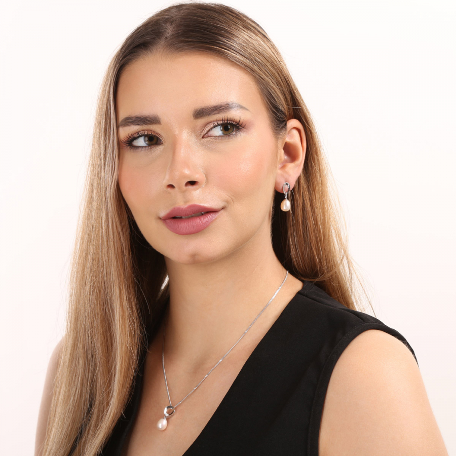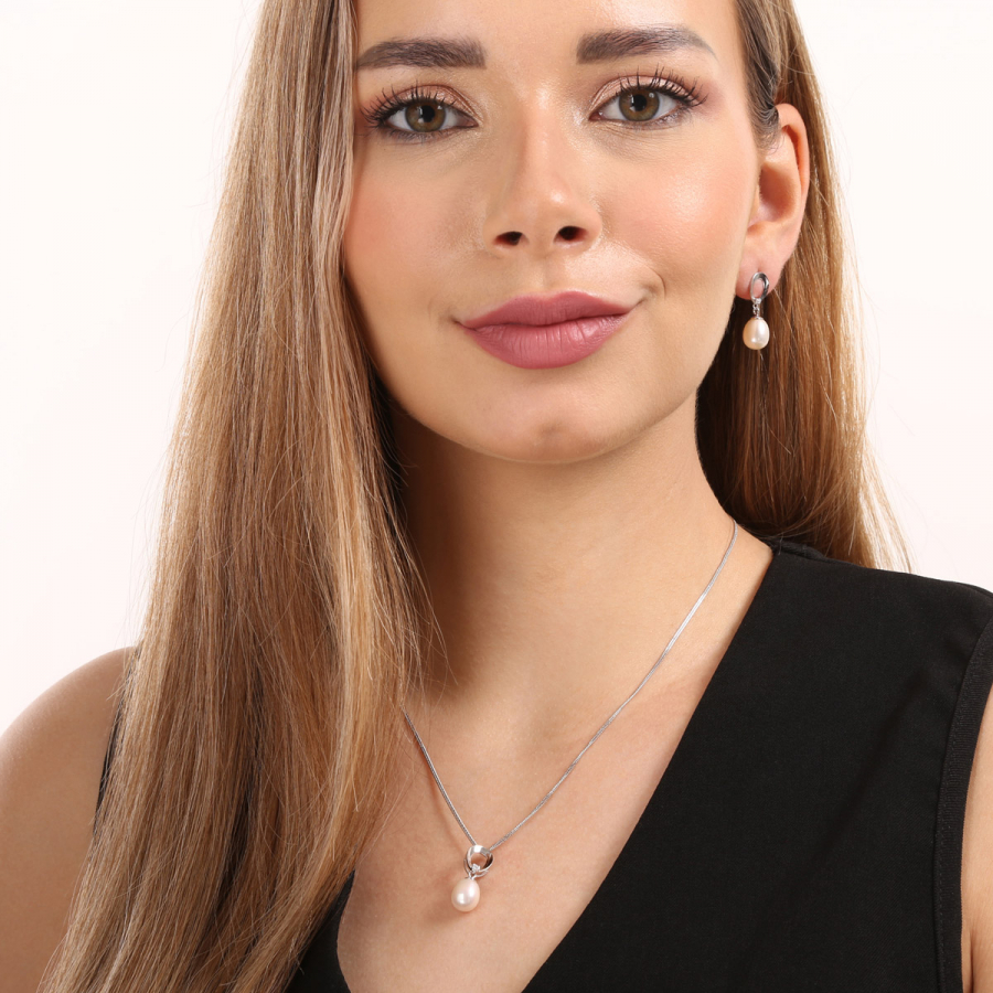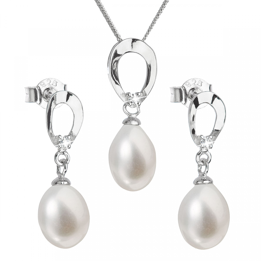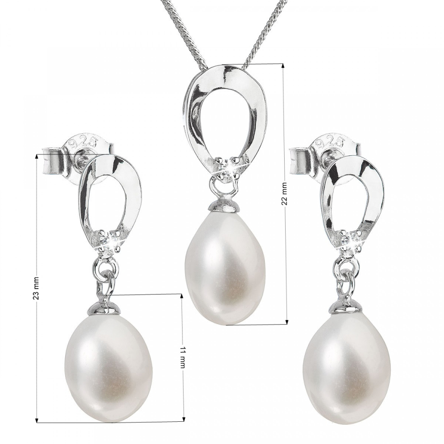 Tá obsahuje visiace náušnice s bielymi oválnymi perlami a náhrdelník s perlovým príveskom. Šperky sú vyrobené zo striebra rýdzosti 925/1000 s rhodiovanou povrchovou úpravou , sú zdobené bielymi riečnymi perlami najvyššej kvality AAA a doplnené malými blýskavými zirkónmi. Dĺžka náhrdelníka je 45 cm a visiace náušnice sú dlhé 23 mm. Náhrdelník ani náušnice neobsahujú nikel, a tak ich bez obáv môžu nosiť aj alergici. Náušnice zo súpravy zapnete na puzetu, ktorá ich ochráni proti nechcenej strate.