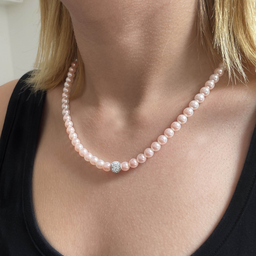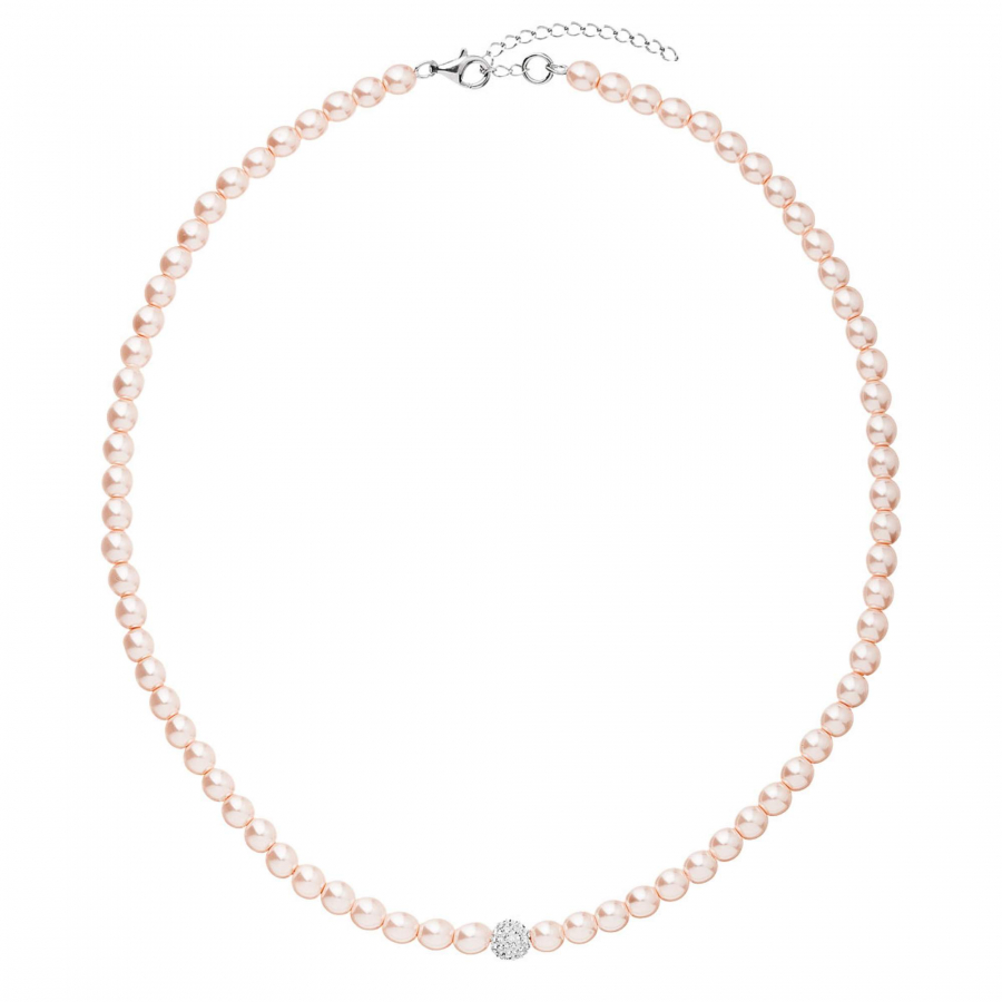 Perlový náhrdelník 32063.3 v dĺžke 45+5 cm je poskladaný z malých ružových perál, medzi ktoré je navlečená gulička vysadená mnohými Preciosa kryštáliky v bielej farbe. Na zapínanie náhrdelníka bolo použité striebro rýdzosti 925/1000, ktoré prešlo úpravou ródiom. Ródium striebro ochráni proti sčernaniu, zožltnutiu i poškriabaniu. Náhrdelník je vhodný aj pre alergikov , neobsahuje totiž nikel.