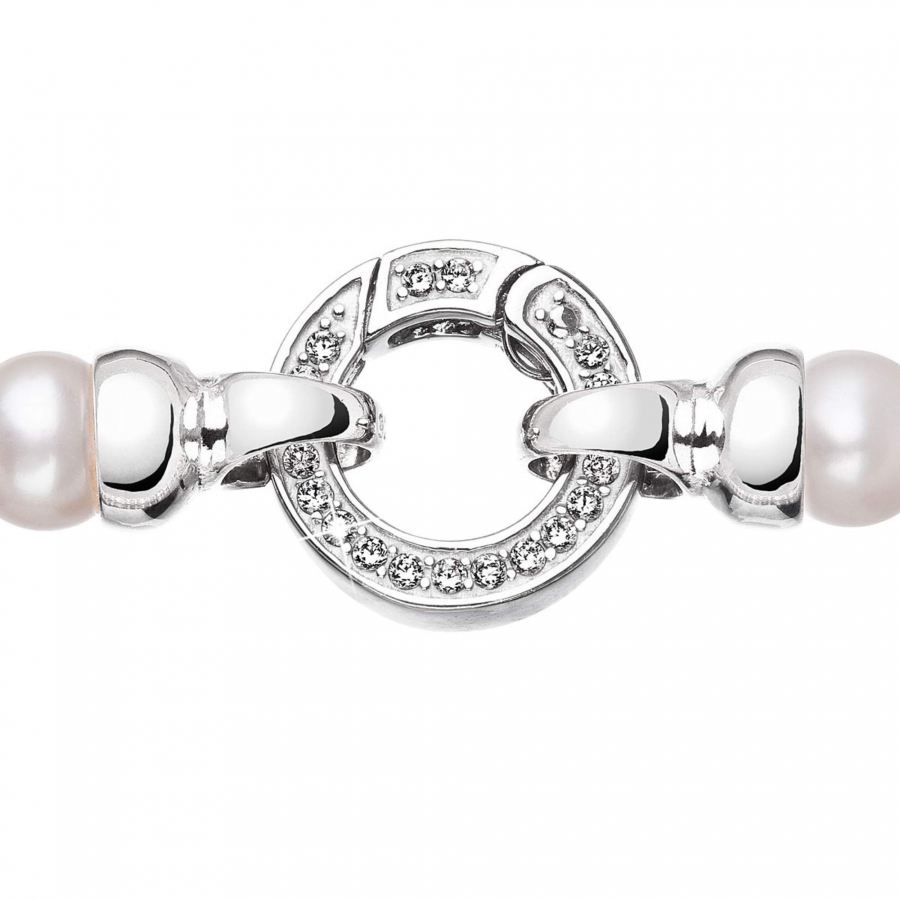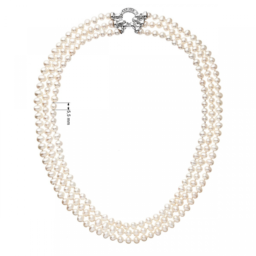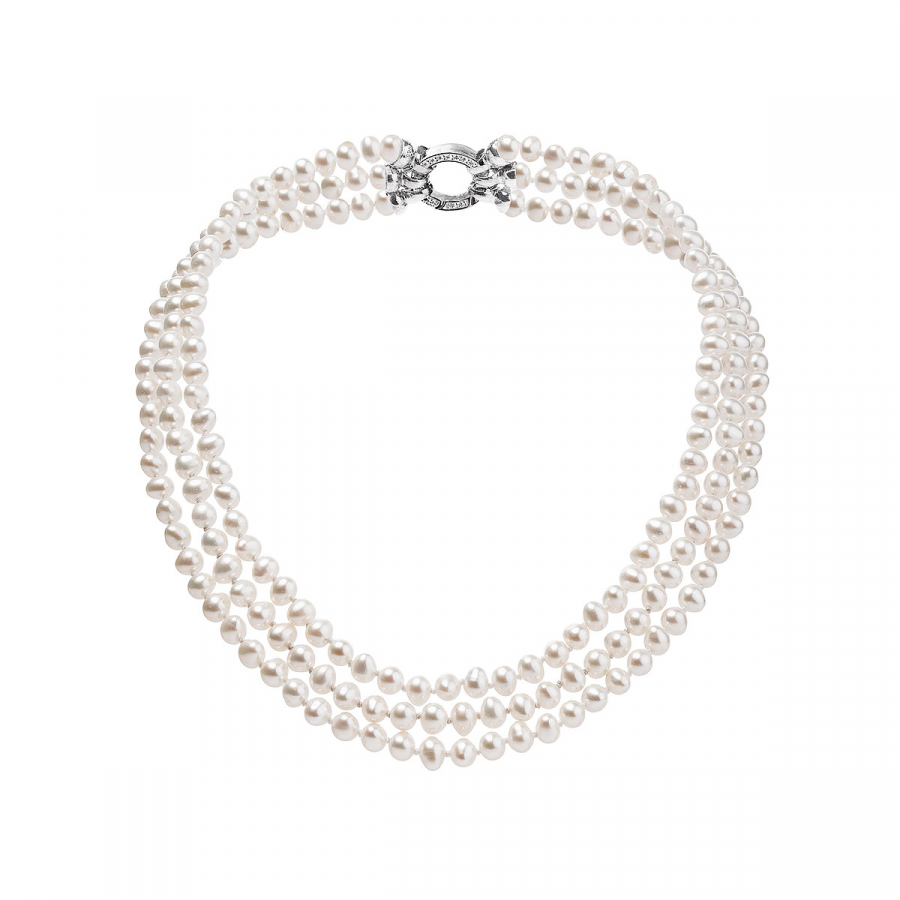Perlový náhrdelník 22035.1 z bielych riečnych perál s dĺžkou 45 cm vnútorný návlek a 48 cm dĺžka druhého radu a tretí rad má 51 cm. Každá perla je zaistená uzlíkovou väzbou , a tak sa pri nechcenom pretrhnutí náhrdelníka nestane, že sa vám perly rozkotúľajú na všetky strany. Zaujímavo riešené okrúhle strieborné zapínanie zdobené niekoľkými trblietavými zirkónmi dodáva náhrdelníku na elegancii. Striebro použité na zapínanie má rýdzosť 925/1000 a ródiovú povrchovú úpravu. Náhrdelník neobsahuje nikel, a tak ho môžu bez obáv nosiť aj alergici.