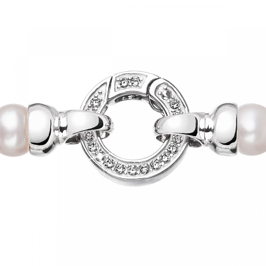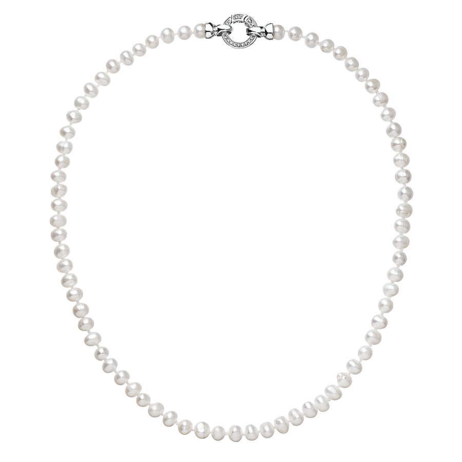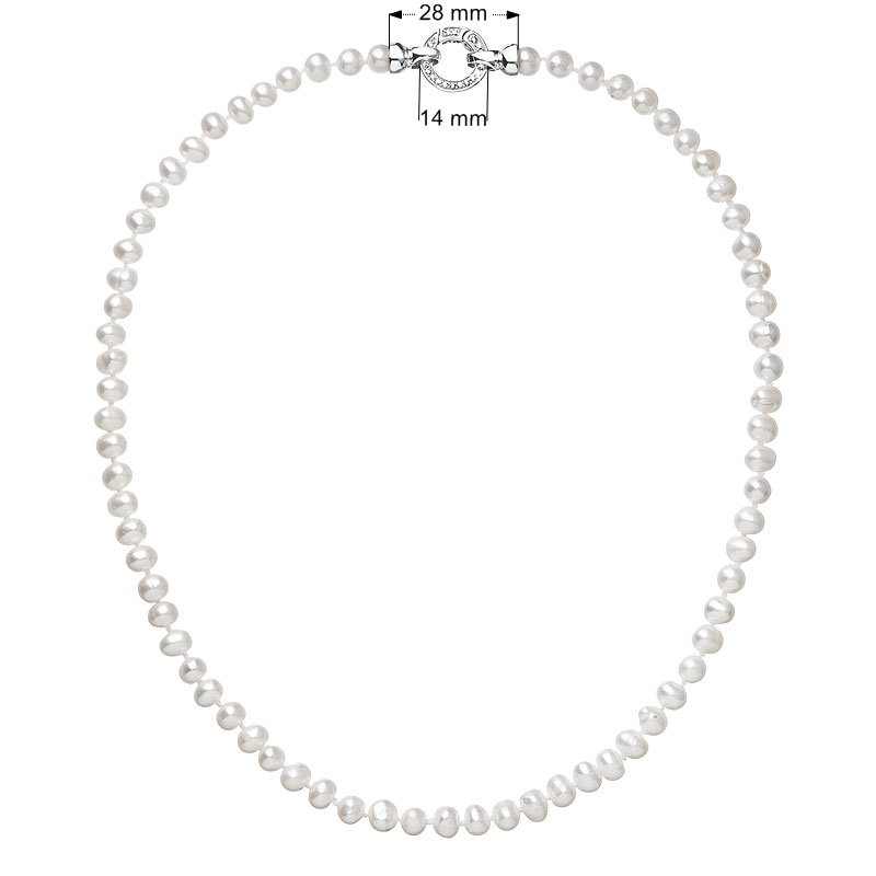 Perlový náhrdelník 22001.1 o celkovej dĺžke 45 cm sa skladá z oválnych pravých riečnych perál v bielej farbe. Každá perla je zaistená uzlíkovou väzbou , a tak sa pri nechcenom pretrhnutí náhrdelníka nestane, že sa vám perly rozkotúľajú na všetky strany. Zaujímavo riešené okrúhle strieborné zapínanie zdobené niekoľkými trblietavými zirkónmi dodáva náhrdelníku na elegancii. Striebro použité na zapínanie má rýdzosť 925/1000 a ródiovú povrchovú úpravu. Náhrdelník neobsahuje nikel, a tak ho môžu bez obáv nosiť aj alergici.