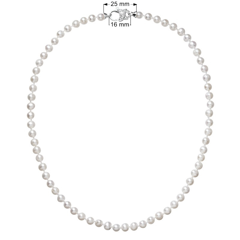 Perlový náhrdelník 22002.1 o celkovej dĺžke 45 cm sa skladá z oválnych pravých riečnych perál v bielej farbe. Každá perla je zaistená uzlíkovou väzbou , a tak sa pri nechcenom pretrhnutí náhrdelníka nestane, že sa vám perly rozkotúľajú na všetky strany. Zaujímavo je riešené strieborné zapínanie náhrdelníka v tvare karabíny s niekoľkými ozdobnými zirkónmi. Striebro použité na zapínanie náhrdelníka má rýdzosť 925/1000 a ródiovú povrchovú úpravu. Náhrdelník neobsahuje nikel, a tak ho môžu nosiť aj alergici.
