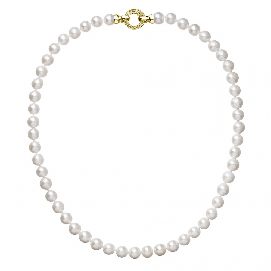 Perlový náhrdelník 22003.1 o celkovej dĺžke 45 cm v bielej farbe. Každá perla je zaistená uzlíkovou väzbou , a tak sa pri nechcenom pretrhnutí náhrdelníka nestane, že sa vám perly rozkotúľajú na všetky strany. Zaujímavo riešené okrúhle pozlátené strieborné zapínanie zdobené niekoľkými trblietavými zirkónmi dodáva náhrdelníku na elegancii. Striebro použité na zapínanie má rýdzosť 925/1000 a povrchovú úpravu zlatom. Náhrdelník neobsahuje nikel, a tak ho môžu bez obáv nosiť aj alergici.