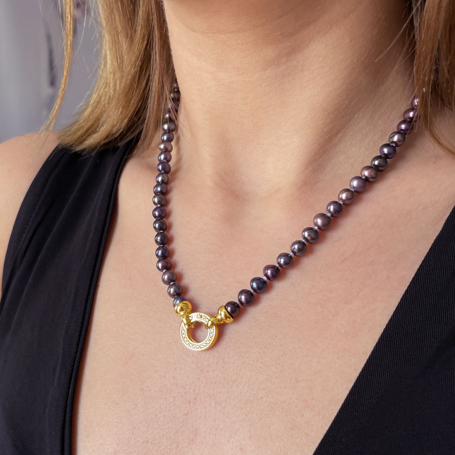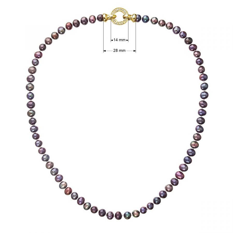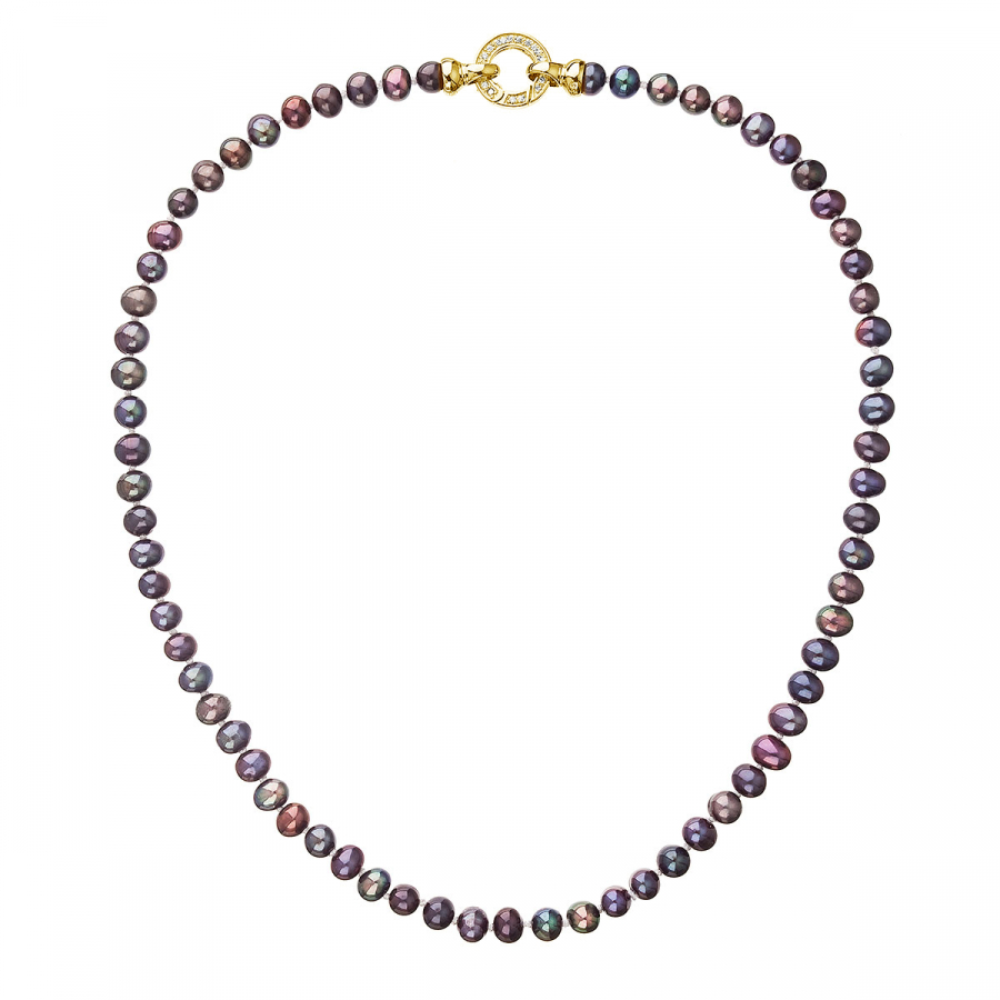 Perlový náhrdelník 22001.3 o celkovej dĺžke 45 cm sa skladá z oválnych pravých riečnych perál v tmavo modrofialovej farbe . Každá perla je zaistená uzlíkovou väzbou , a tak sa pri nechcenom pretrhnutí náhrdelníka nestane, že sa vám perly rozkotúľajú na všetky strany. Zaujímavo riešené okrúhle pozlátené strieborné zapínanie zdobené niekoľkými trblietavými zirkónmi dodáva náhrdelníku na elegancii. Striebro použité na zapínanie má rýdzosť 925/1000 a je pozlátené. Náhrdelník neobsahuje nikel, a tak ho môžu bez obáv nosiť aj alergici.
