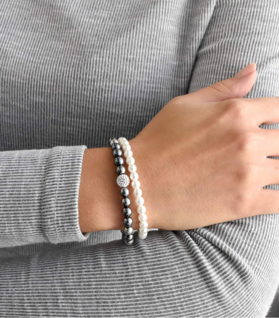 Náramky sú navlečené z okrúhlych perál. Šedý náramok je doplnený o striebornú guľôčku bohato vysadenú bielymi Preciosa kryštálmi . Náramky sa vzájomne skvele dopĺňajú, avšak môžete ich nosiť aj zvlášť, záleží len na vás.