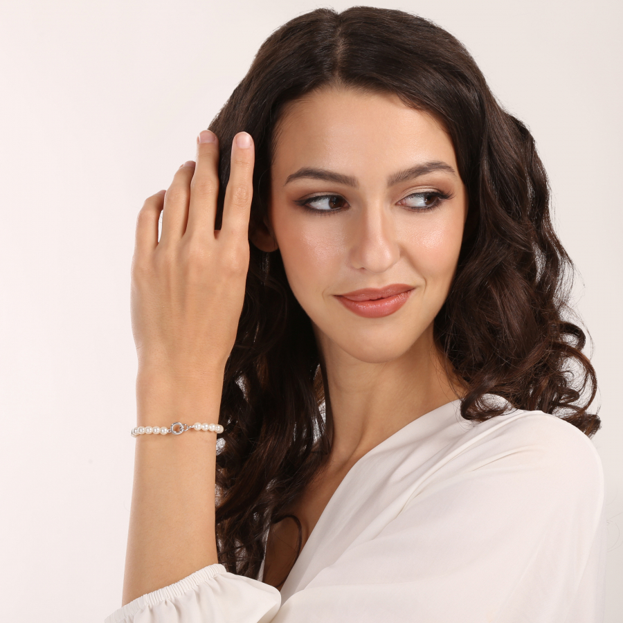 Perlový náramok 33123.1 v dĺžke 18 cm je poskladaný z malých bielych perál, má veľmi vkusné strieborné zapínanie na okrúhlu elegantnú sponu. Náramok je vhodný aj pre alergikov , neobsahuje totiž žiadny nikel.