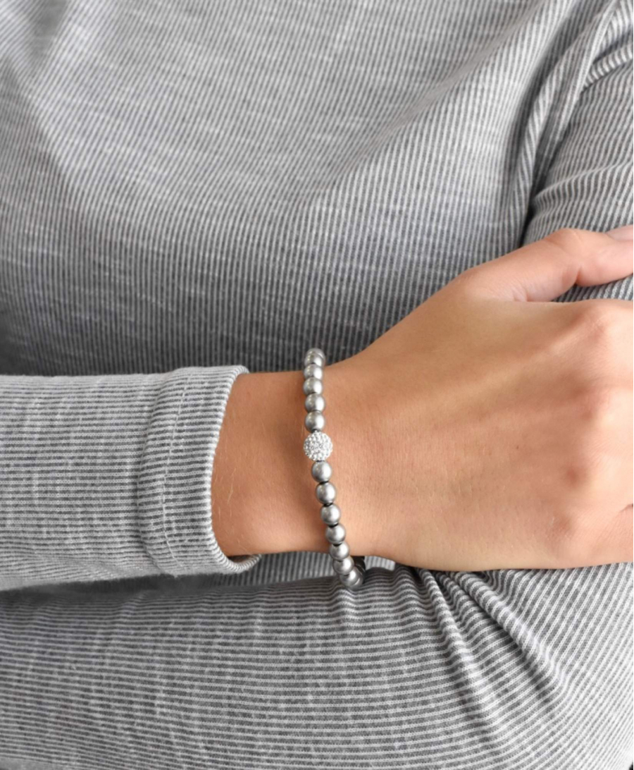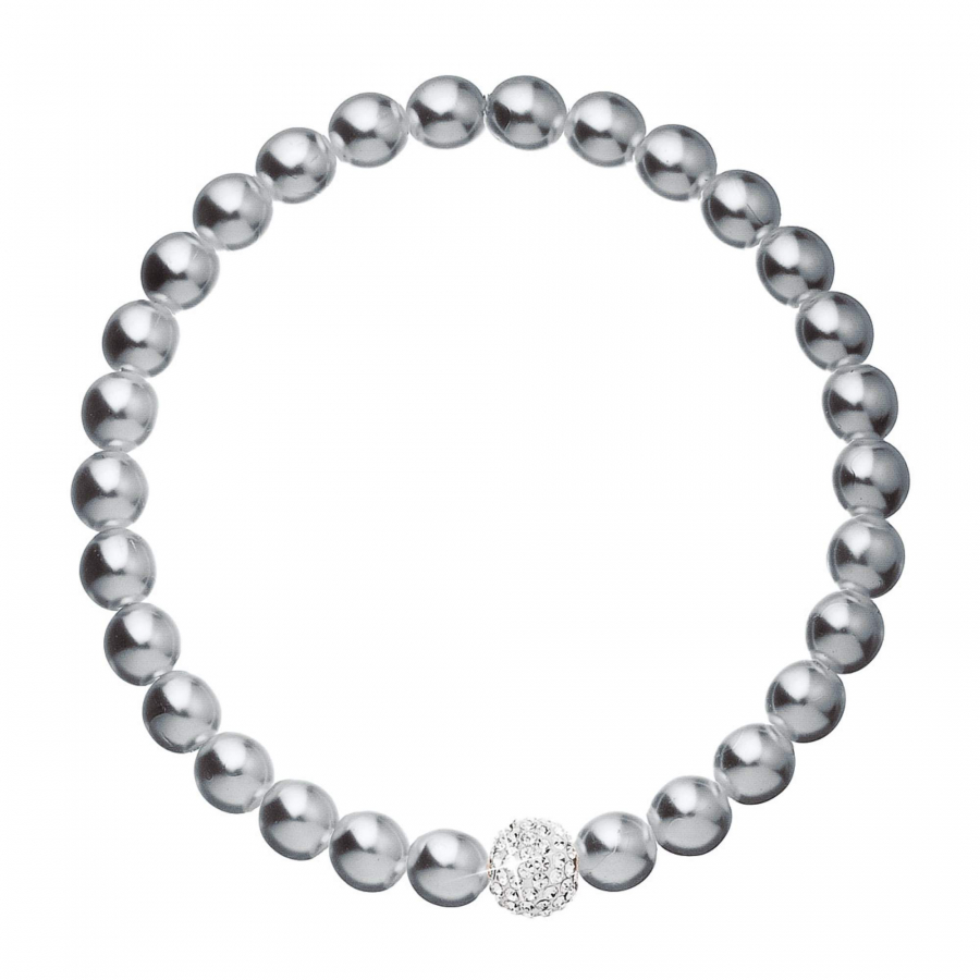 Perlový náramok 33115.3 v dĺžke 16 cm je poskladaný z malých šedých perál, medzi ktoré je navlečená gulička vysadená mnohými Preciosa kryštáliky v bielej farbe. Náramok je vhodný aj pre alergikov , neobsahuje totiž žiadny nikel.