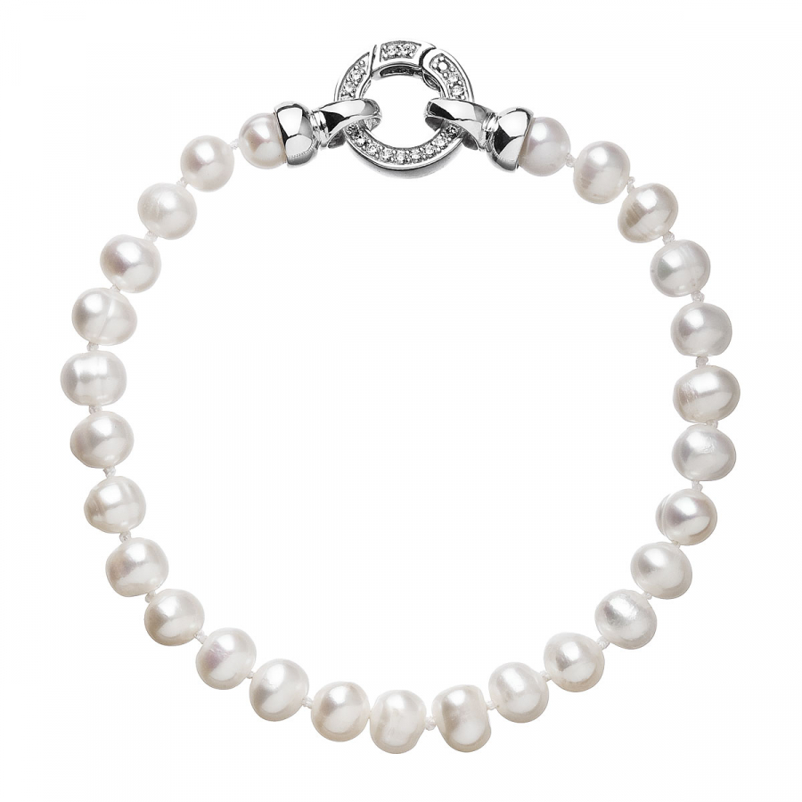 Perlový náramok s dĺžkou 19,5 cm je zložený z oválnych riečnych perál veľkosti 5,5 - 6 mm kvality B v bielej farbe. Každá perla je zaistená uzlíkovou väzbou , a tak sa pri nechcenom pretrhnutí náramku nestane, že sa vám perly rozkotúľajú na všetky strany. Zaujímavo riešené okrúhle strieborné zapínanie zdobené niekoľkými trblietavými zirkónmi dodáva náramku na elegancii. Striebro použité na zapínanie má rýdzosť 925/1000 a ródiovú povrchovú úpravu. Náramok neobsahuje nikel , a tak ho môžu bez obáv nosiť aj alergici.