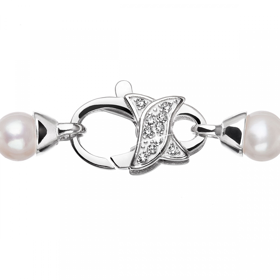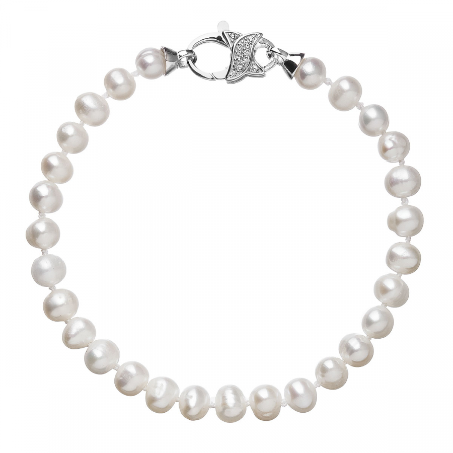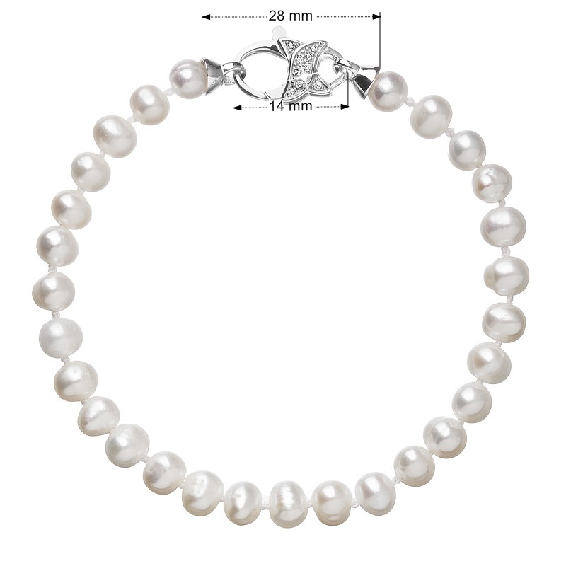 Perlový náramok 23002.1 o dĺžke 19,5 cm je zložený z celkom 28 pravých riečnych perál kvality B v bielej farbe. Každá perla je zaistená uzlíkovou väzbou , a tak sa pri nechcenom pretrhnutí náramku nestane, že sa vám perly rozkotúľajú na všetky strany. Zaujímavo je riešené strieborné zapínanie náramku v tvare karabíny s niekoľkými ozdobnými zirkónmi. Striebro použité na zapínanie náramku má rýdzosť 925/1000 a ródiovú povrchovú úpravu. Náramok neobsahuje nikel, a tak ho môžu nosiť aj alergici.