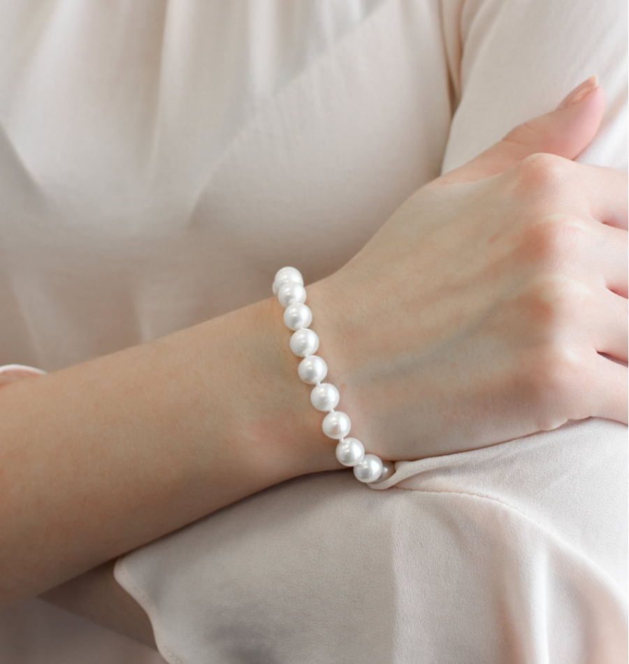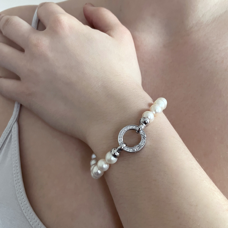 Perlový náramok s dĺžkou 19,5 cm je zložený z celkom 20-21 okrúhlych riečnych perál kvality AA veľkosti 7,5 - 8 mm v bielej farbe. Každá perla je zaistená uzlíkovou väzbou , a tak sa pri nechcenom pretrhnutí náramku nestane, že sa vám perly rozkotúľajú na všetky strany. Zaujímavo riešené okrúhle strieborné zapínanie zdobené niekoľkými trblietavými zirkónmi dodáva náramku na elegancii. Striebro použité na zapínanie má rýdzosť 925/1000 a ródiovú povrchovú úpravu. Náramok neobsahuje nikel , a tak ho môžu bez obáv nosiť aj alergici.