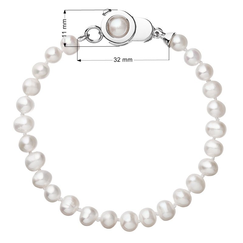 Perlový náramok s dĺžkou 19,5 cm je zložený z celkom 26 oválnych riečnych perál veľkosti 5,5 - 6 mm v bielej farbe. Každá perla je zaistená uzlíkovou väzbou , a tak sa pri nechcenom pretrhnutí náramku nestane, že sa vám perly rozkotúľajú na všetky strany. Jedna perlička navyše sa ešte ukrýva v zaujímavo riešenom striebornom zapínaní s bezpečnostnou poistkou . Striebro použité na zapínanie náramku má rýdzosť 925/1000 a ródiovú povrchovú úpravu. Náramok neobsahuje nikel, a tak ho môžu obliecť aj alergici.