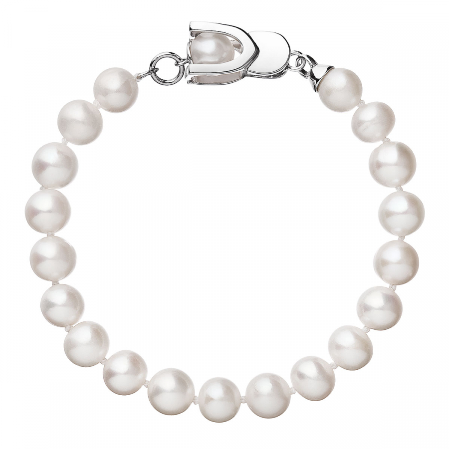 Perlový náramok 23007.1 o dĺžke 19,5 cm je zložený z celkom 19 okrúhlych riečnych perál veľkosti 7,5 - 8 mm v bielej farbe. Každá perla je zaistená uzlíkovou väzbou , a tak sa pri nechcenom pretrhnutí náramku nestane, že sa vám perly rozkotúľajú na všetky strany. Jedna perlička navyše sa ešte ukrýva v zaujímavo riešenom striebornom zapínaní s bezpečnostnou poistkou . Striebro použité na zapínanie náramku má rýdzosť 925/1000 a ródiovú povrchovú úpravu. Náramok neobsahuje nikel, a tak ho môžu obliecť aj alergici.