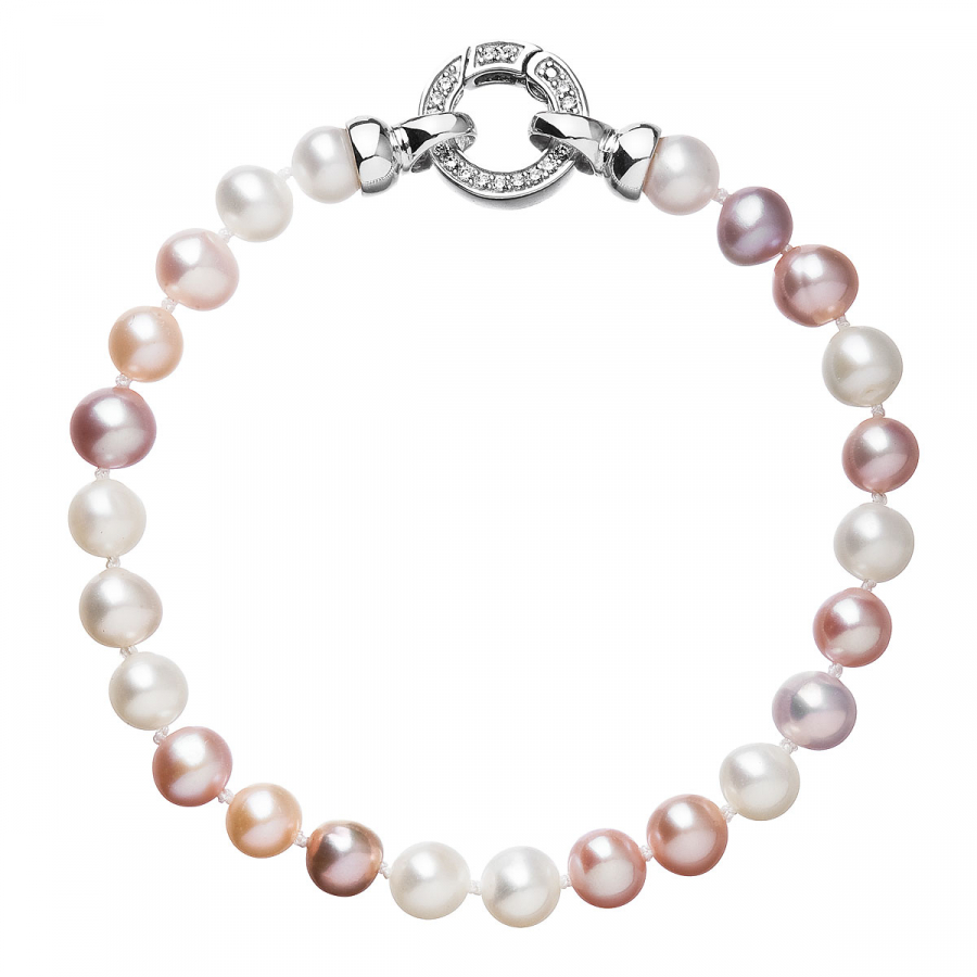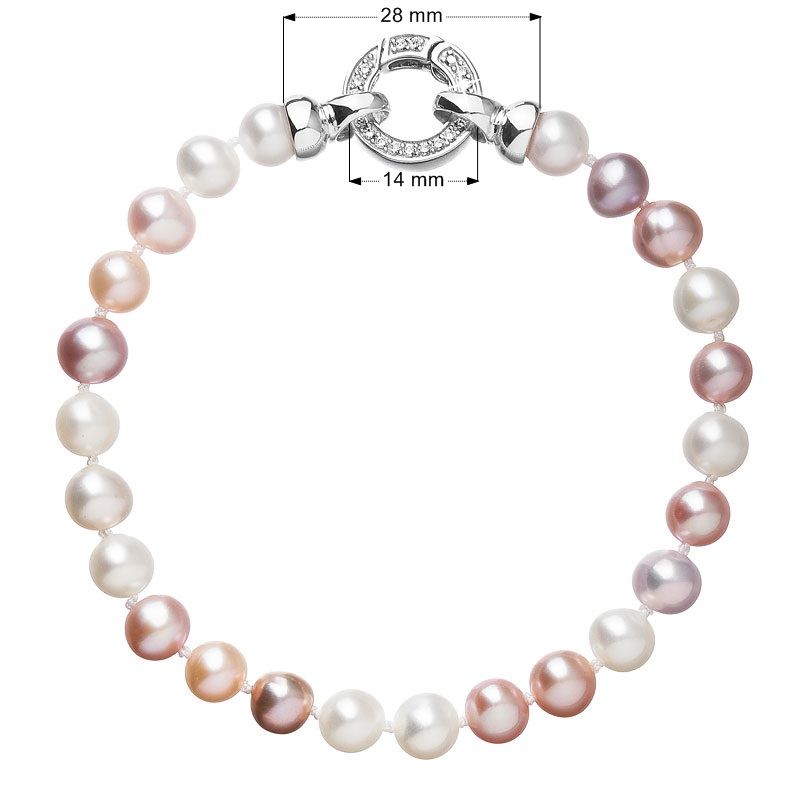 Perlový náramok s dĺžkou 19,5 cm je zložený z celkom 24 oválnych riečnych perál veľkosti 6-6,5 mm v rôznych farbách jemných tónov. Každá perla je zaistená uzlíkovou väzbou , a tak sa pri nechcenom pretrhnutí náramku nestane, že sa vám perly rozkotúľajú na všetky strany. Zaujímavo riešené okrúhle strieborné zapínanie zdobené niekoľkými trblietavými zirkónmi dodáva náramku na elegancii. Striebro použité na zapínanie má rýdzosť 925/1000 a ródiovú povrchovú úpravu. Náramok neobsahuje nikel , a tak ho môžu bez obáv nosiť aj alergici.