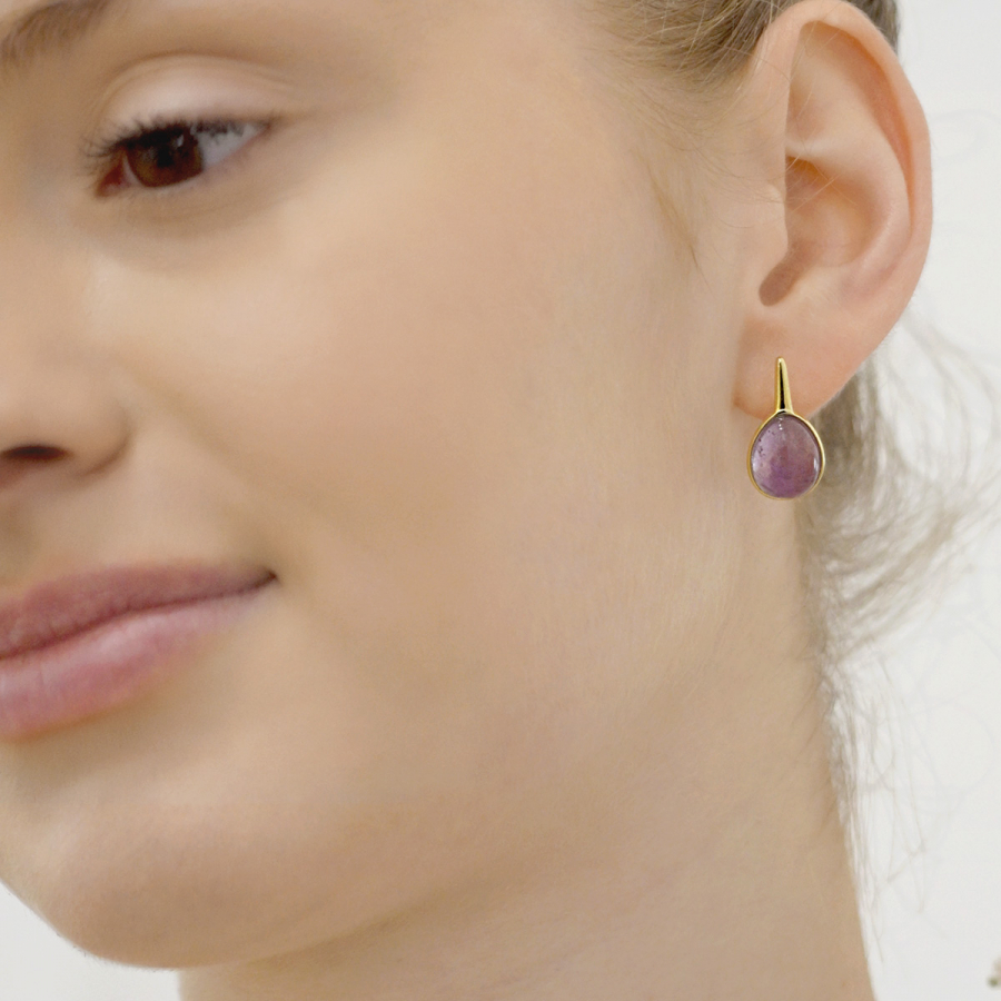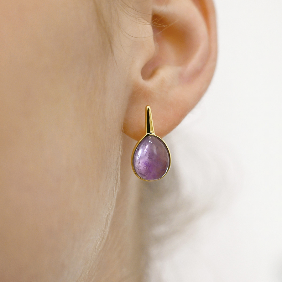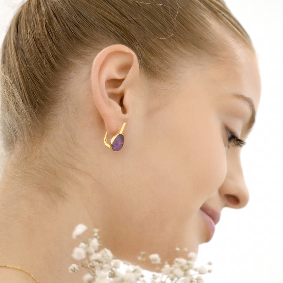 Náušnice sú vyrobené zo striebra rýdzosti 925/1000 s jemným pozláteným povrchom, ktorý dodáva šperku luxusný a teplý lesk. Ich jedinečný tvar kvapky je precízne zdobený ametystom vo fialovej farbe, ktorý je lemovaný zlatistou linkou pozláteného striebra. Tento kontrastný prvok vytvára harmonický celok, kde fialový kameň symbolizuje duchovný rozvoj, intuíciu a vnútornú múdrosť. Zapínanie na ruský patent zaisťuje pohodlné a spoľahlivé nosenie.