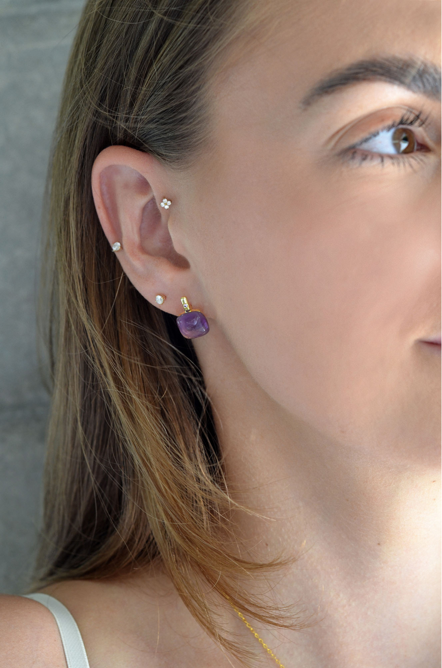 Náušnice sú vyrobené zo striebra rýdzosti 925/1000 s jemným pozláteným povrchom, ktorý dodáva šperku luxusný a teplý lesk. Ich unikátny dizajn kombinuje precíznu geometriu s duchovnou symbolikou - kameň ametyst v tvare štvorca je precízne vsadený do štíhlej pozlátenej tyčky, ktorá je navyše ozdobená trblietavým zirkónom. Tento kontrastný prvok vytvára harmonický celok, kde fialový kameň symbolizuje duchovný rozvoj, intuíciu a vnútornú múdrosť. Visiaci tvar náušníc podčiarkuje ich eleganciu a dynamiku, zapínanie na ruský patent potom zaisťuje pohodlné a spoľahlivé nosenie.