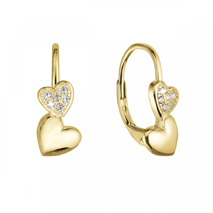Náušnice s dvoma srdiečkami umiestnenými nad sebou predstavujú ikonu lásky a spojenia . Zlaté lesklé srdiečko zdôrazňuje jednoduchosť a čistotu, druhé srdiečko vysadené zirkónmi symbolizuje nehu a cit . Tento romantický motív dodáva náušniciam pôvab a vkus.