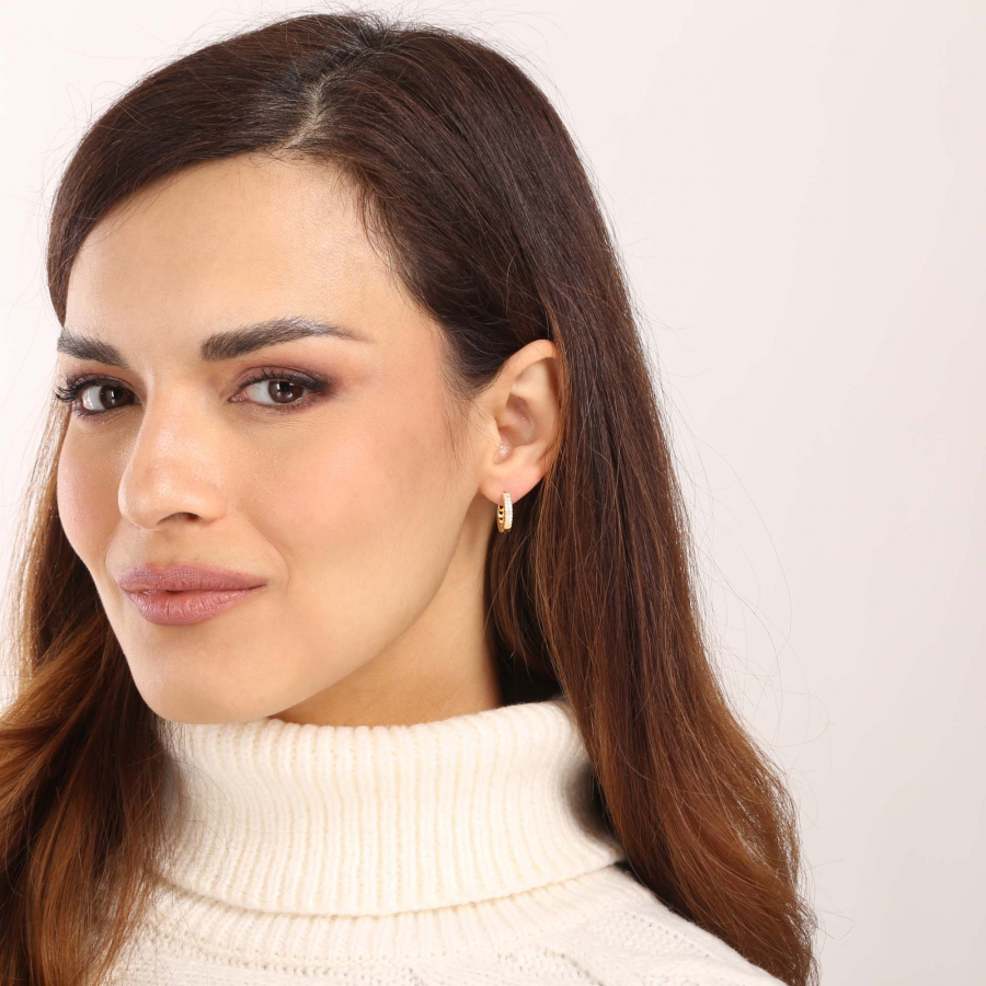 Biele zirkóny lemujú kruhovú náušnicu v dvoch radoch a dodáva im dokonalý vzhľad. Zapínanie náušníc je na spôsob francúzskeho zámku, ktorý spoľahlivo predíde strate náušníc.